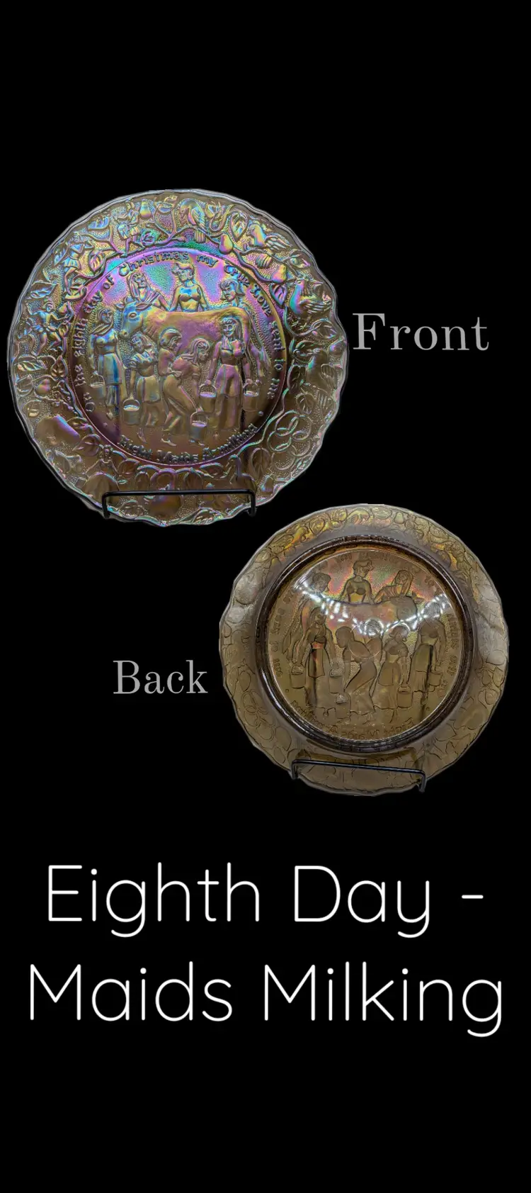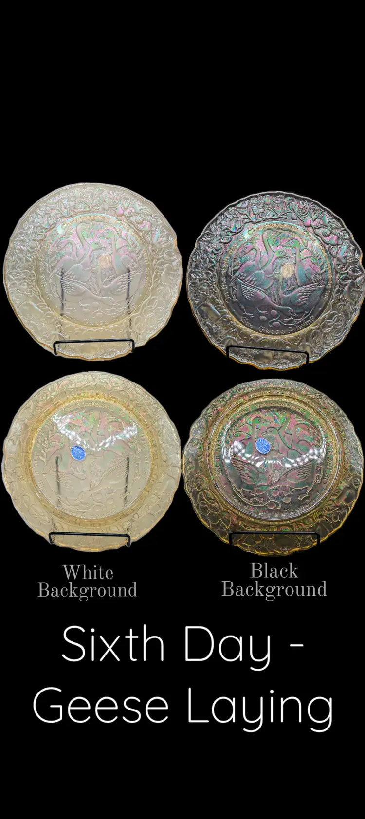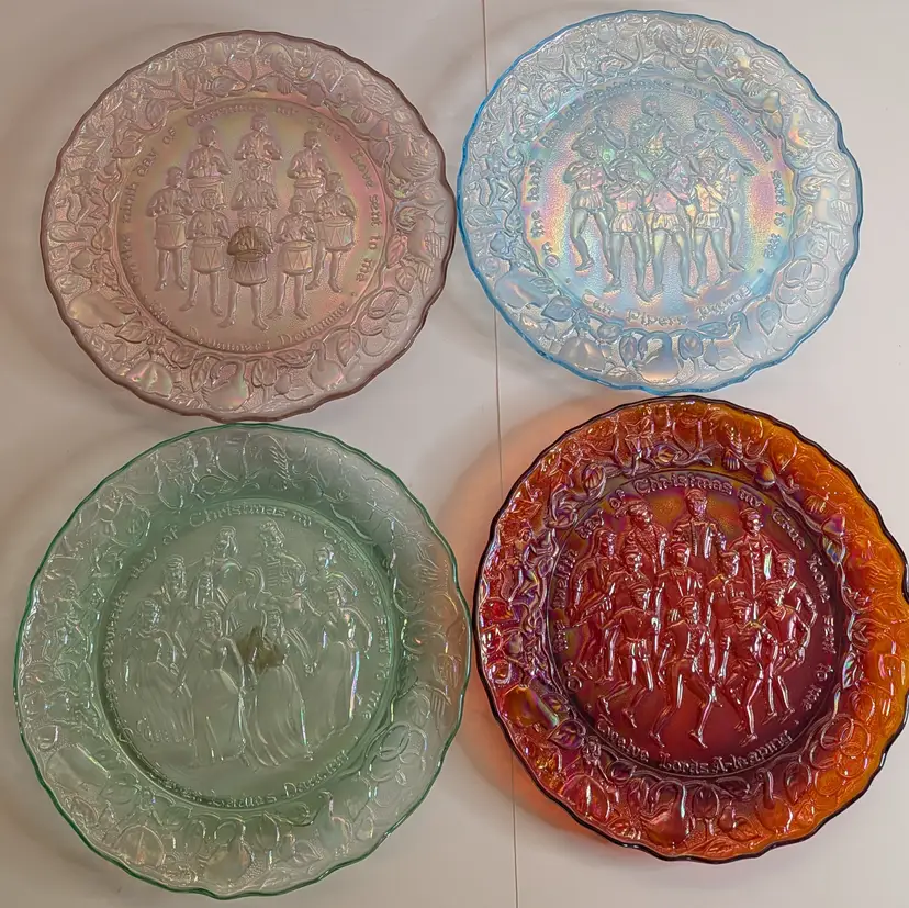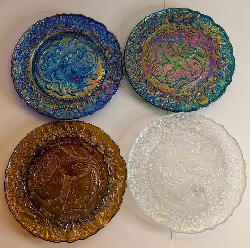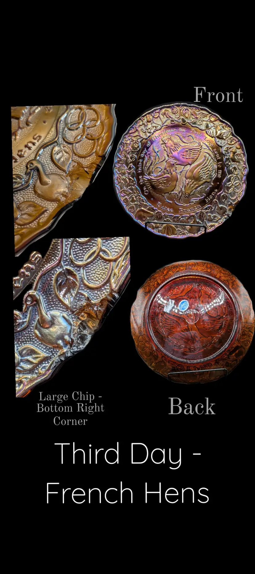 The 1970-81 Imperial Lenox 12 Days of Christmas Carnival Glass Plates Complete Set of all twelve (12) days. Total combined weight is roughly 25 pounds (lbs). Plate "three French hens" has a large chip out of the bottom right corner and is photographed. It is the only one that has any major damage to it, however there is one that has a small chip on the back inner rim. All the rest are in superb condition! Most have original stickers on them, have dates, & are in a beautiful array of colors/iridescent hues. Each one is different & more stunning than the next! Some have a slightly frosted texture to them & some are slightly risque. These measure roughly 8 ¾ inches in diameter with a height of 1", & are all stunningly decorated with very intricate details showing significance to each day.