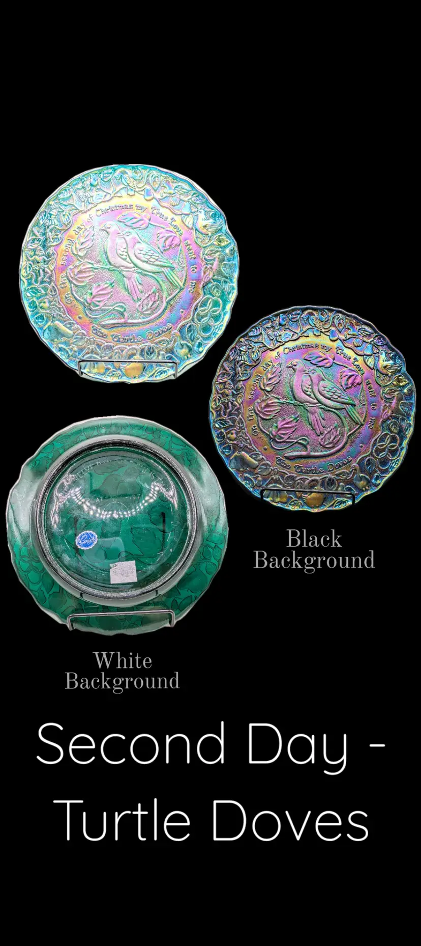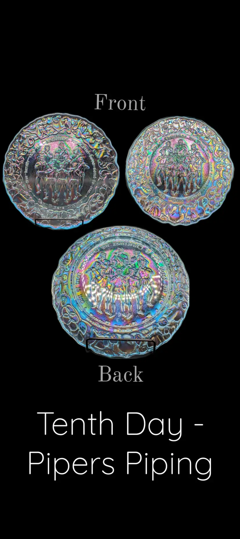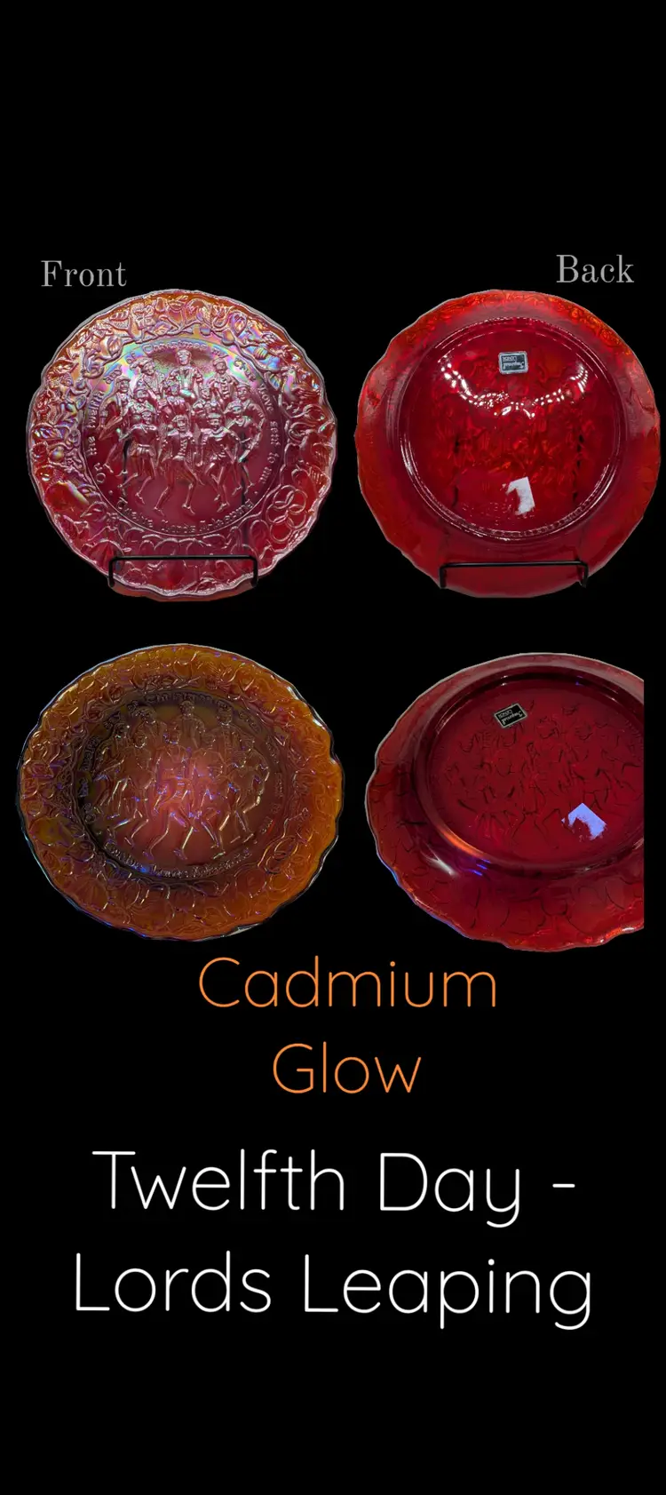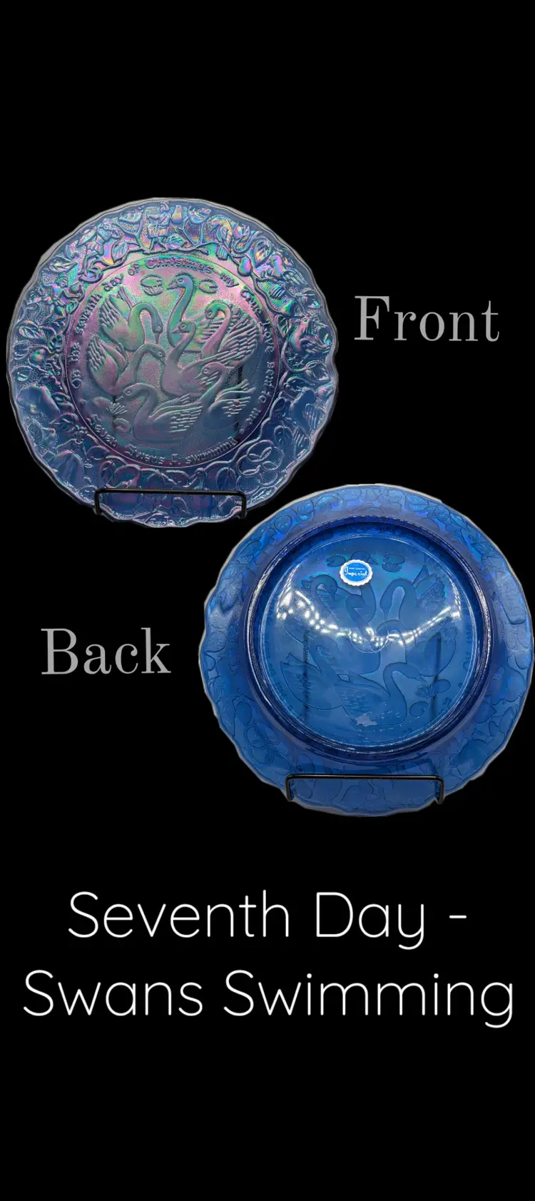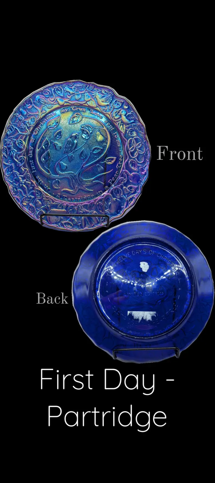 The 1970-81 Imperial Lenox 12 Days of Christmas Carnival Glass Plates Complete Set of all twelve (12) days. Total combined weight is roughly 25 pounds (lbs). Plate "three French hens" has a large chip out of the bottom right corner and is photographed. It is the only one that has any major damage to it, however there is one that has a small chip on the back inner rim. All the rest are in superb condition! Most have original stickers on them, have dates, & are in a beautiful array of colors/iridescent hues. Each one is different & more stunning than the next! Some have a slightly frosted texture to them & some are slightly risque. These measure roughly 8 ¾ inches in diameter with a height of 1", & are all stunningly decorated with very intricate details showing significance to each day.