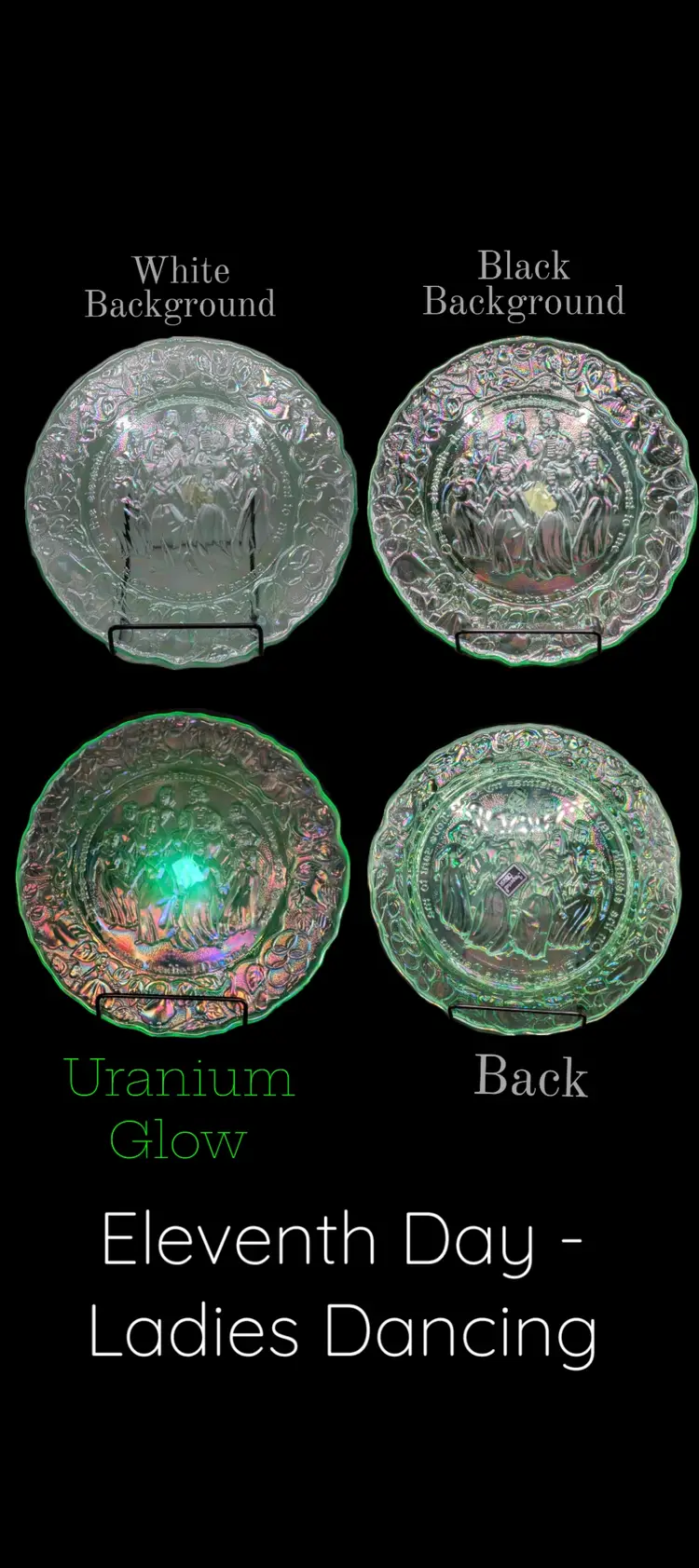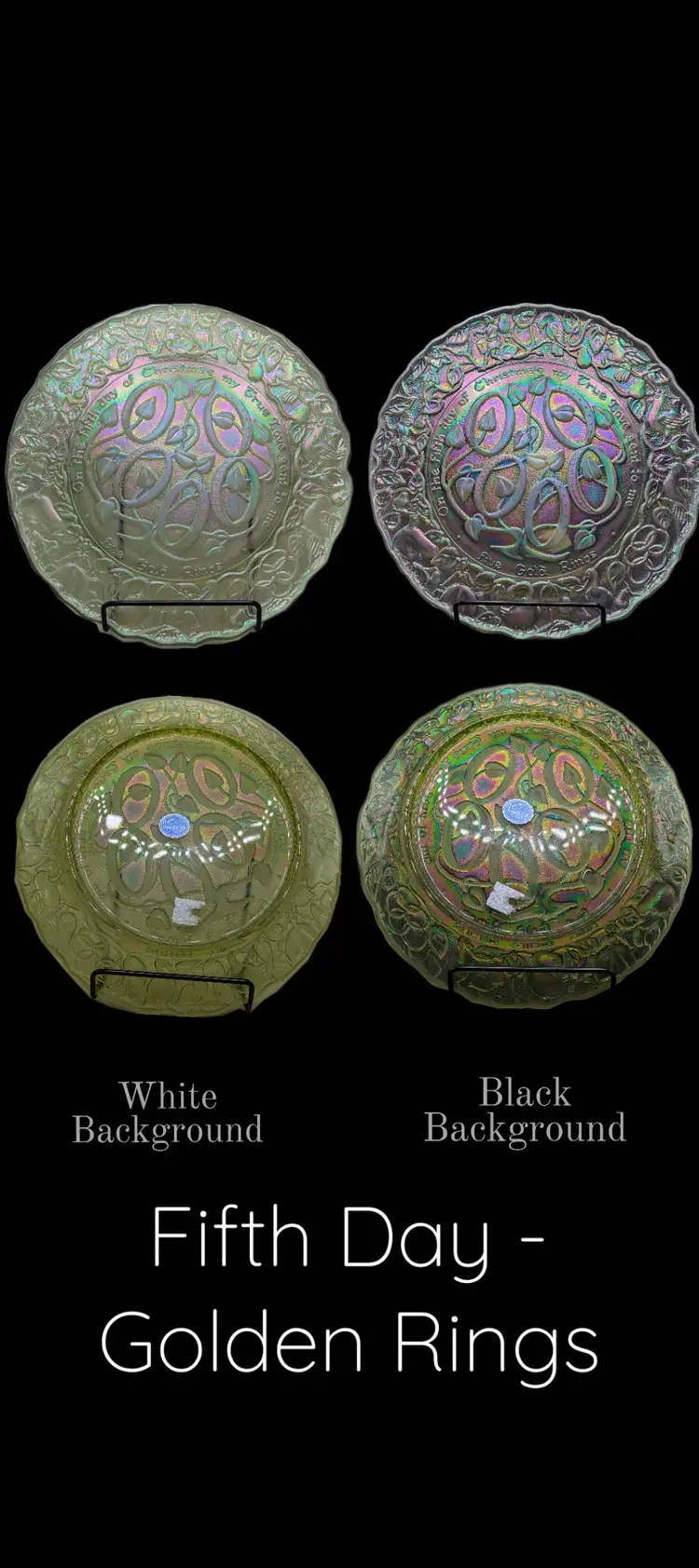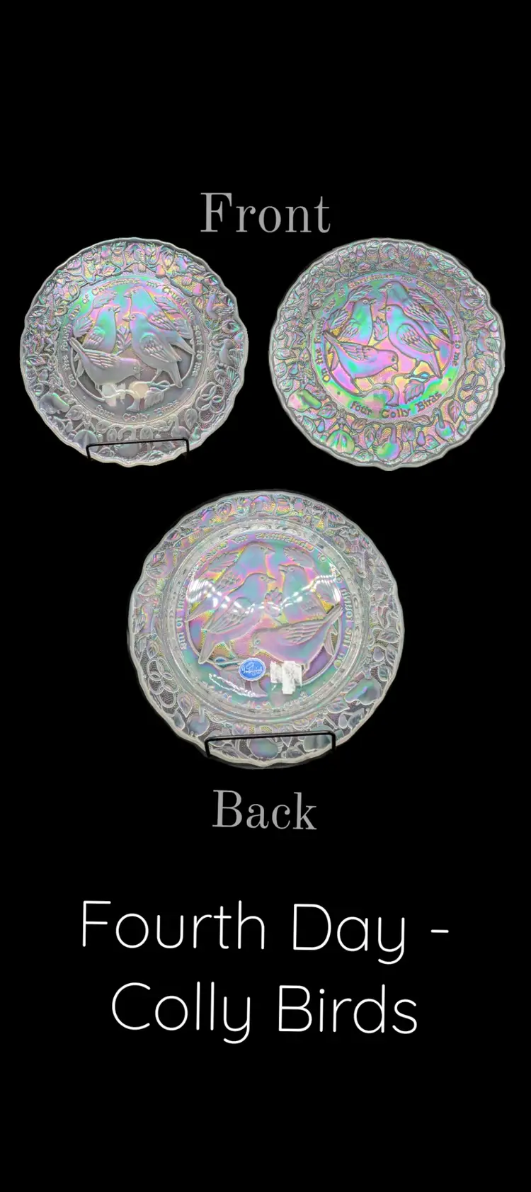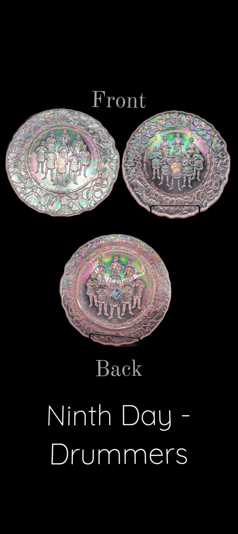 The 1970-81 Imperial Lenox 12 Days of Christmas Carnival Glass Plates Complete Set of all twelve (12) days. Total combined weight is roughly 25 pounds (lbs). Plate "three French hens" has a large chip out of the bottom right corner and is photographed. It is the only one that has any major damage to it, however there is one that has a small chip on the back inner rim. All the rest are in superb condition! Most have original stickers on them, have dates, & are in a beautiful array of colors/iridescent hues. Each one is different & more stunning than the next! Some have a slightly frosted texture to them & some are slightly risque. These measure roughly 8 ¾ inches in diameter with a height of 1", & are all stunningly decorated with very intricate details showing significance to each day.