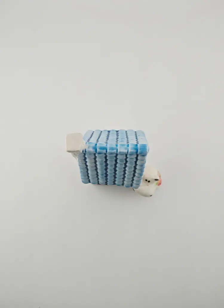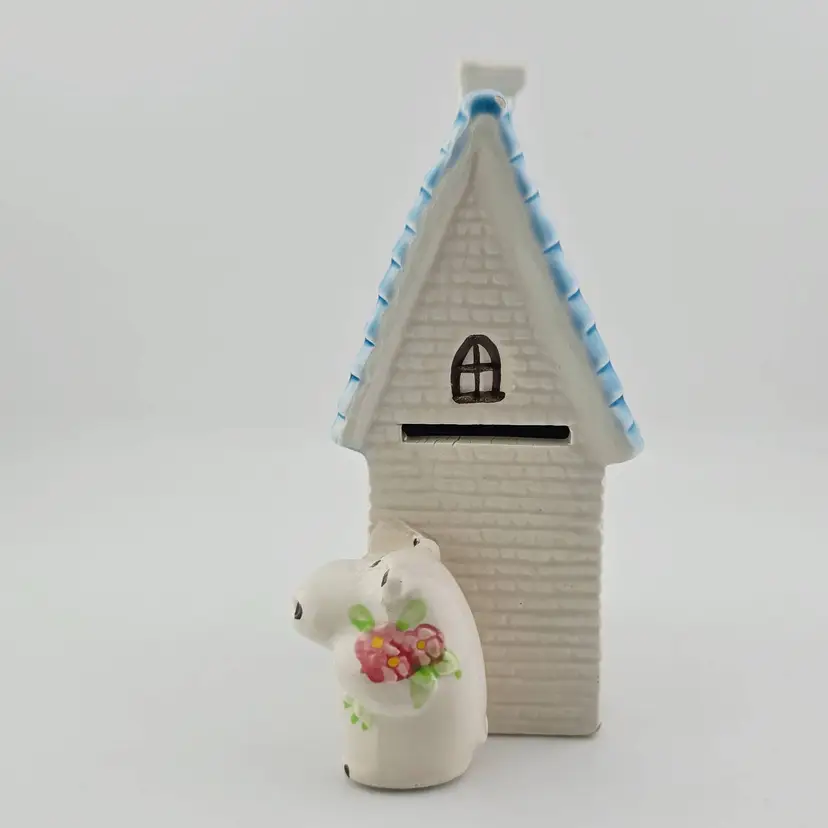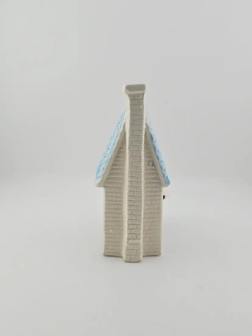 His face seems to have some residue of glaze. One of the corner of bottom house ledger has chip. No plug. 5 inches tall