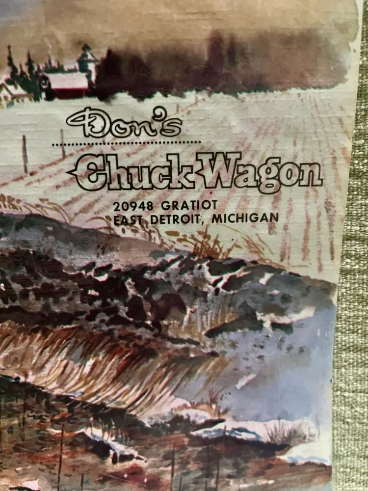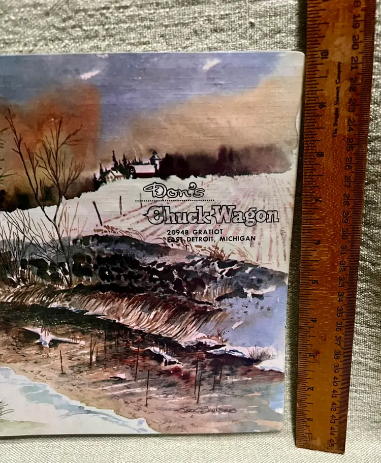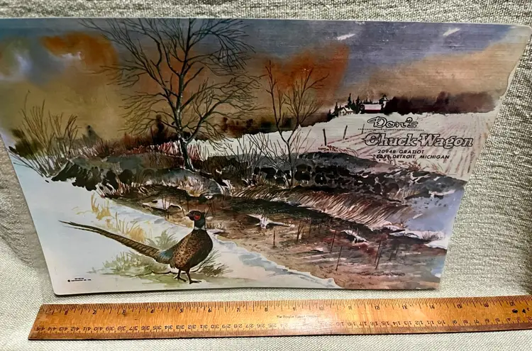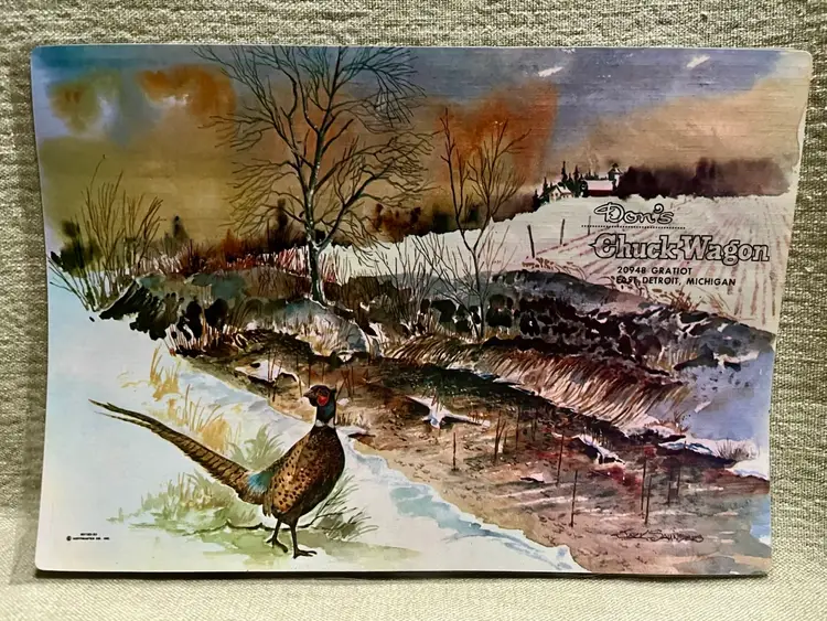 1970s Don’s Chuck Wagon 20948 Gratiot East Detroit Single Laminated Placemat USA ~ winter rural scene with Ring-neck Pheasant. Hoffmaster Co. Inc., 901SD-20