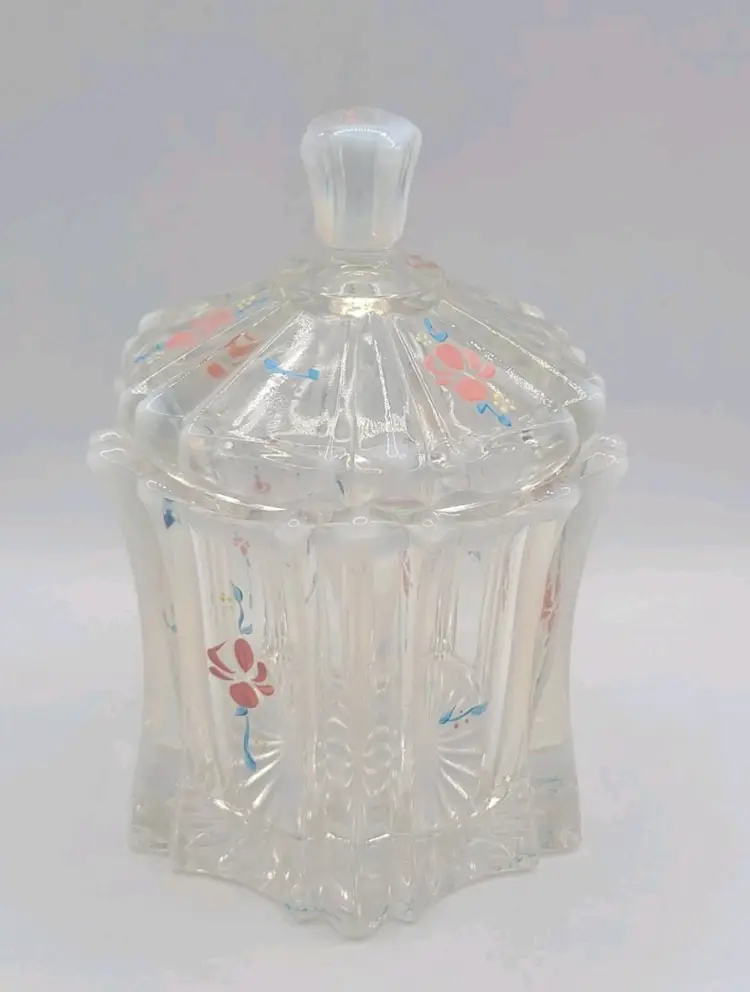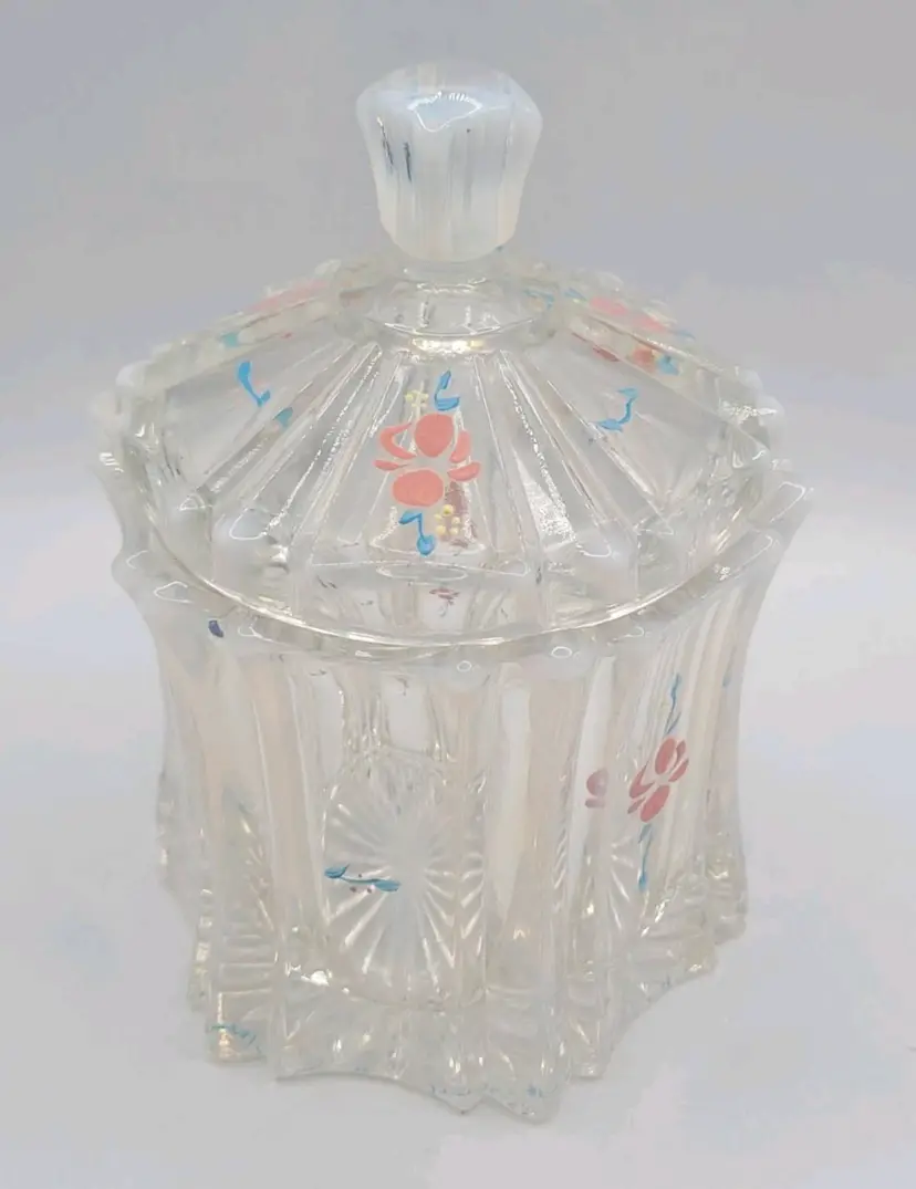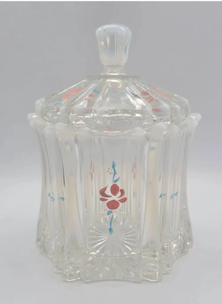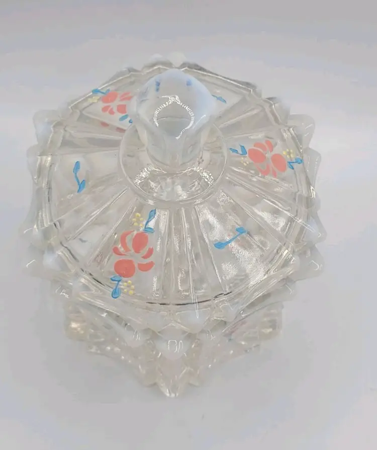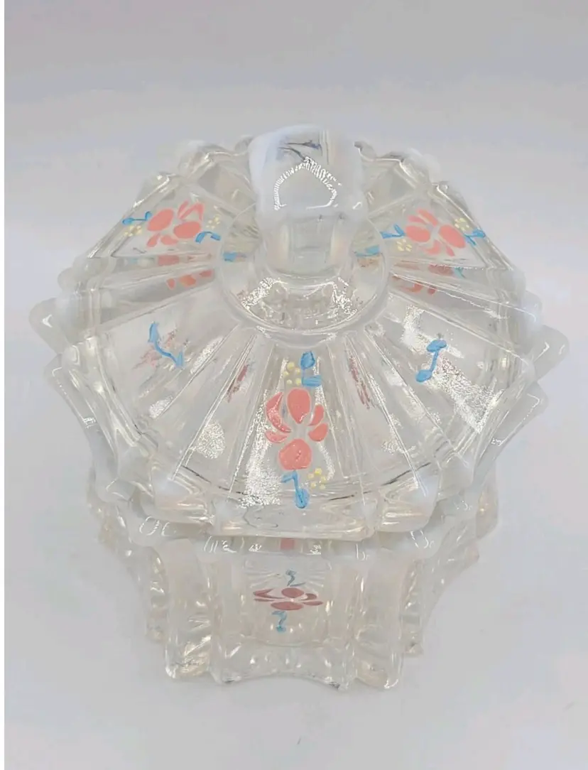 1970s Fenton Opalescent Covered Candy Dish Hand Painted Flowers Signed by Artist Very good condition. *Small chip on inside lid. Really cant see it unless looking for it. See last picture. No cracks or breaks. Minimal surface wear. View pictures Approx. 6.25" H X 4.75" W