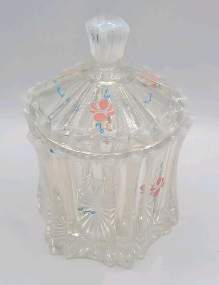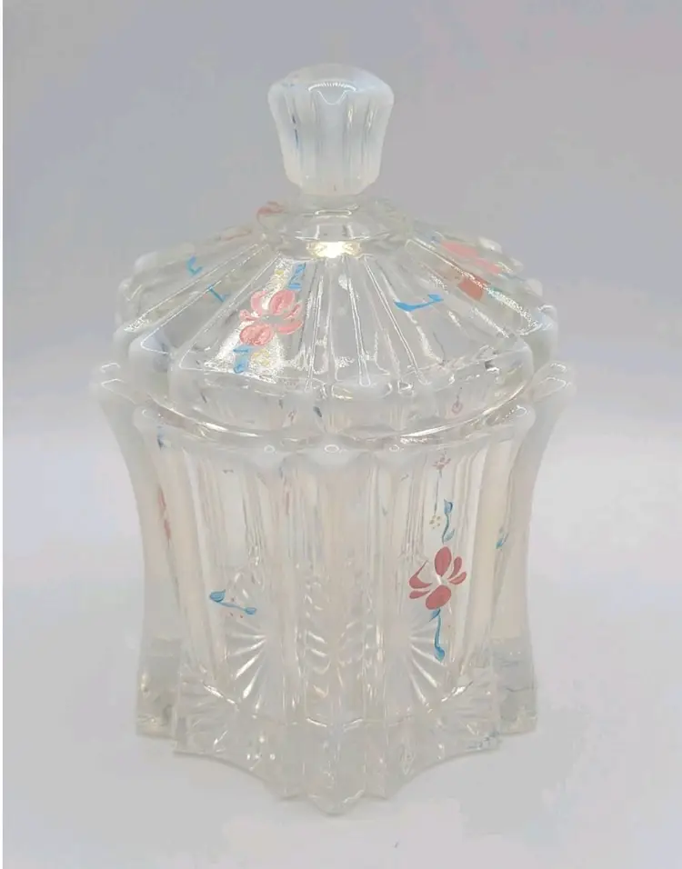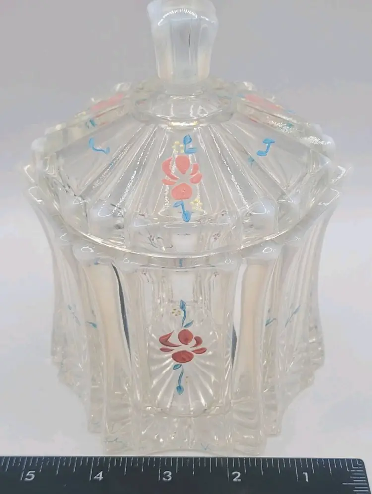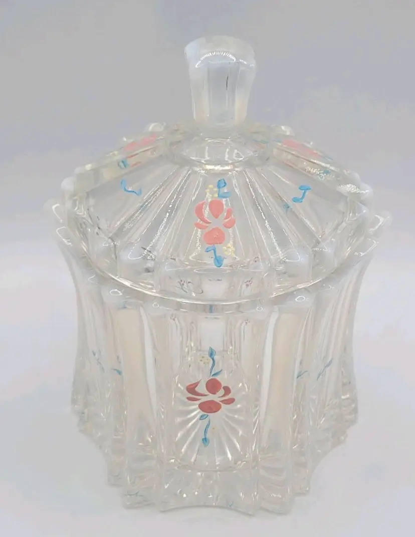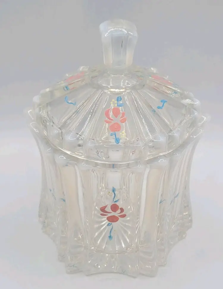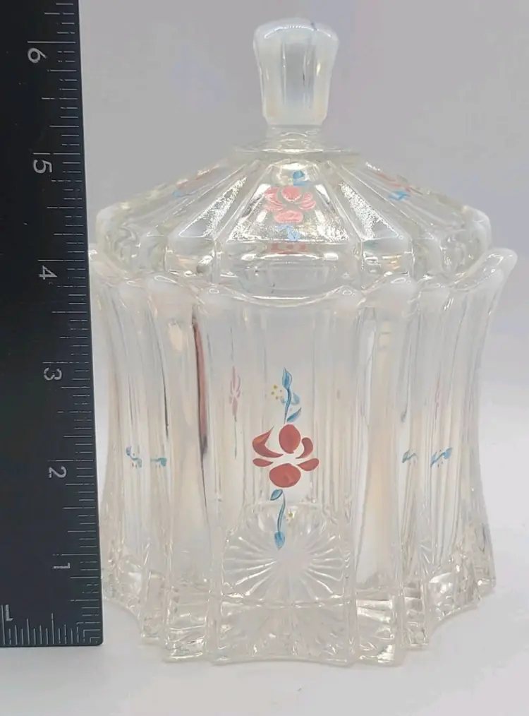 1970s Fenton Opalescent Covered Candy Dish Hand Painted Flowers Signed by Artist Very good condition. *Small chip on inside lid. Really cant see it unless looking for it. See last picture. No cracks or breaks. Minimal surface wear. View pictures Approx. 6.25" H X 4.75" W