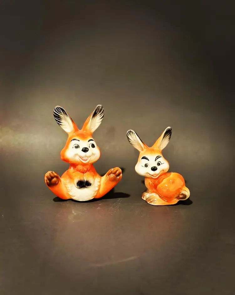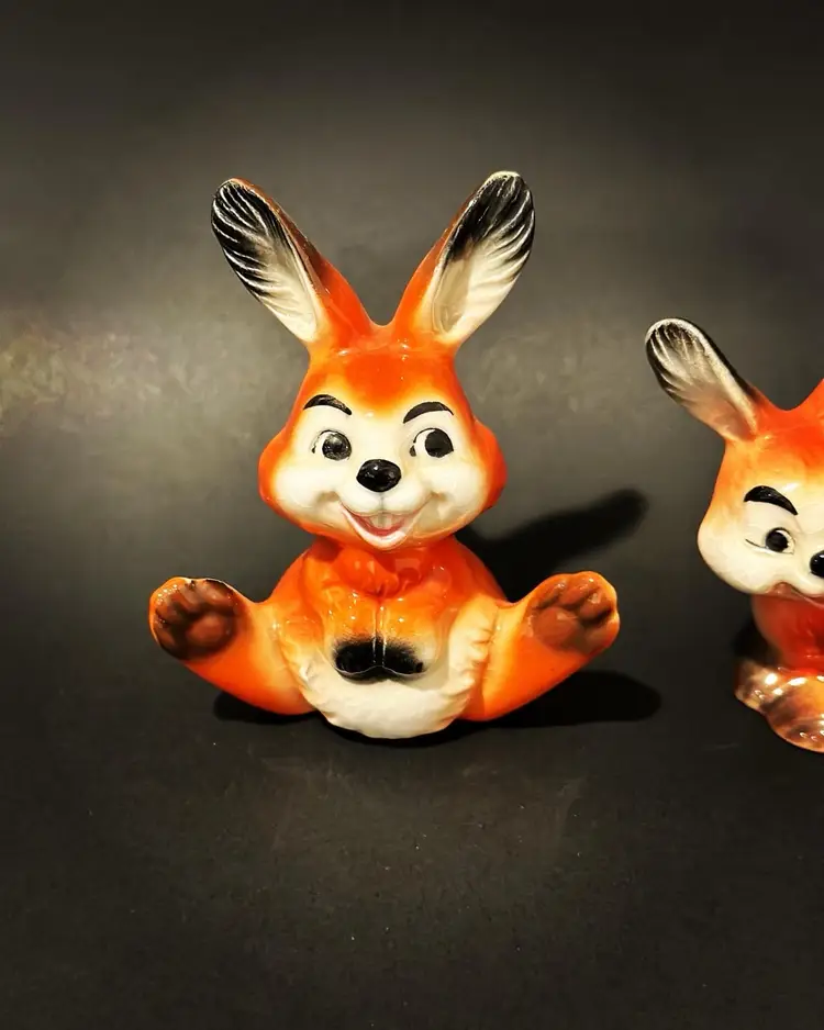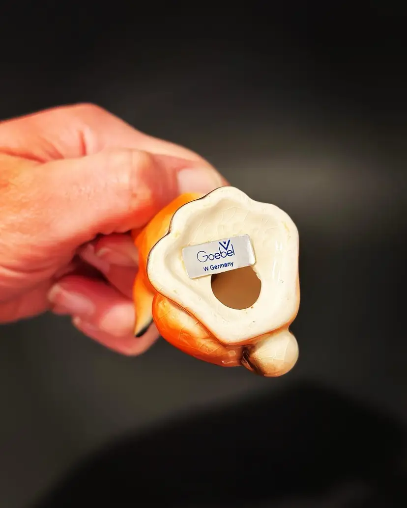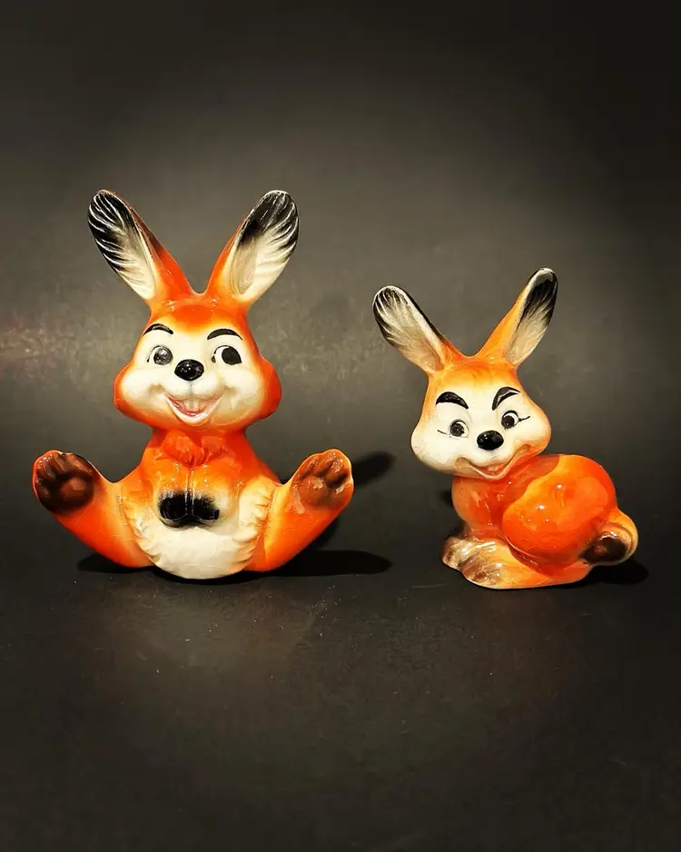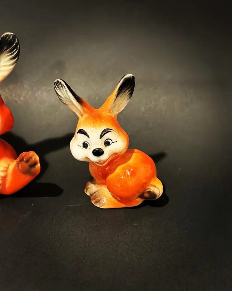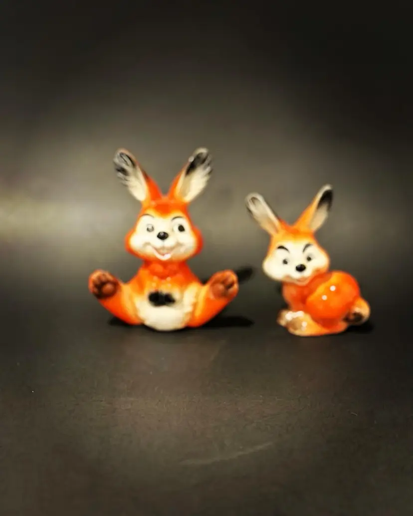 This vintage set of 2 Goebel porcelain figurines featuring adorable bunny rabbits is a must-have for collectors of animal-themed decor. The vibrant orange color of the rabbits adds a cheerful touch to any room. These figurines are made in Germany.