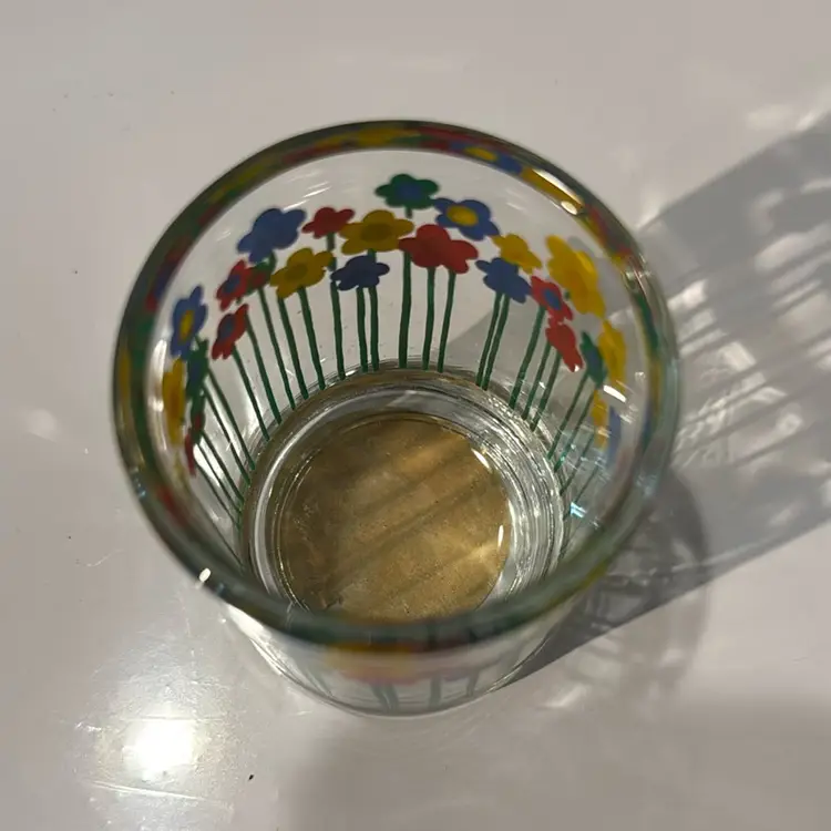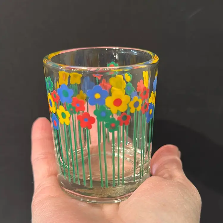 Super groovy 1970s little glass cup. I assume it to be a toothpick holder or for small candles. Paint is still beautifully intact. Measures 2 1/2 inches tall.