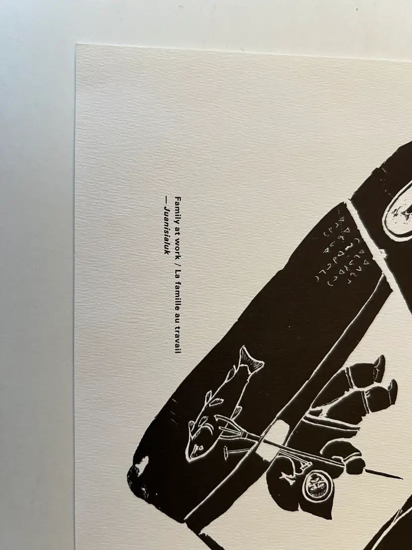 Family at Work/ La famille au travail by Jaunisialuk of the Povungnituk Cooperative. This print is from a portfolio of certified reproductions by La Fédération des Coopératives du Nouveau Quebec, published in the 1970s.