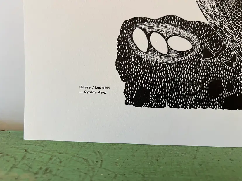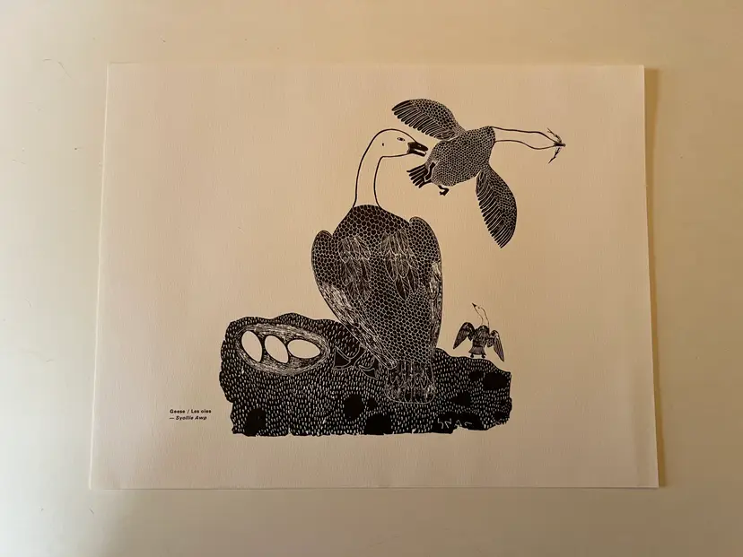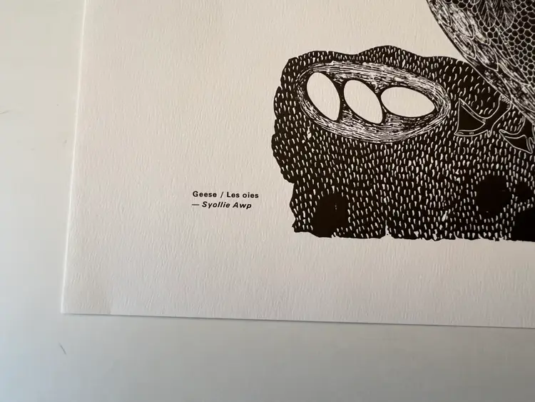 Geese/ Les oies by Syollie Awp of the Povungnituk Cooperative. This print is from a portfolio of certified reproductions by La Fédération des Coopératives du Nouveau Quebec, published in the 1970s.