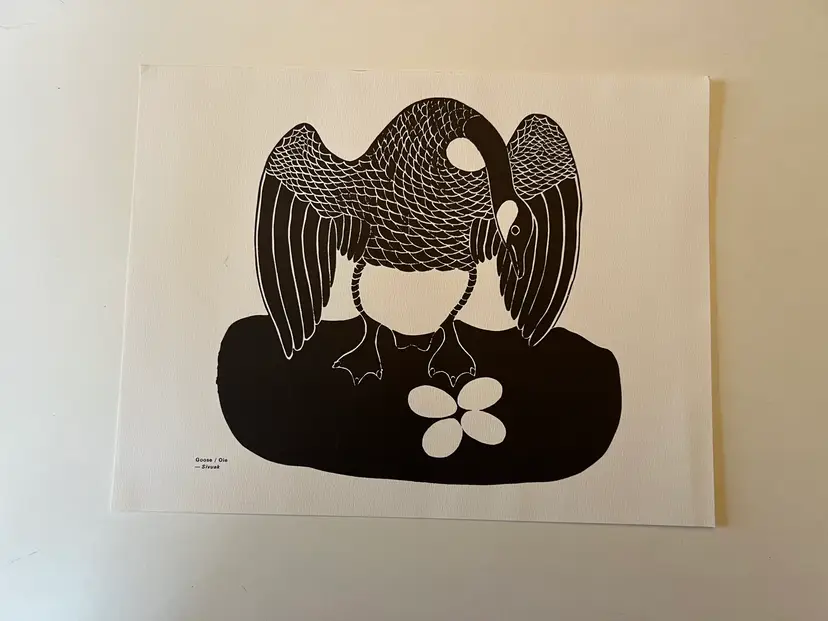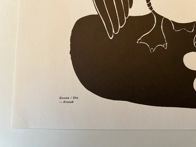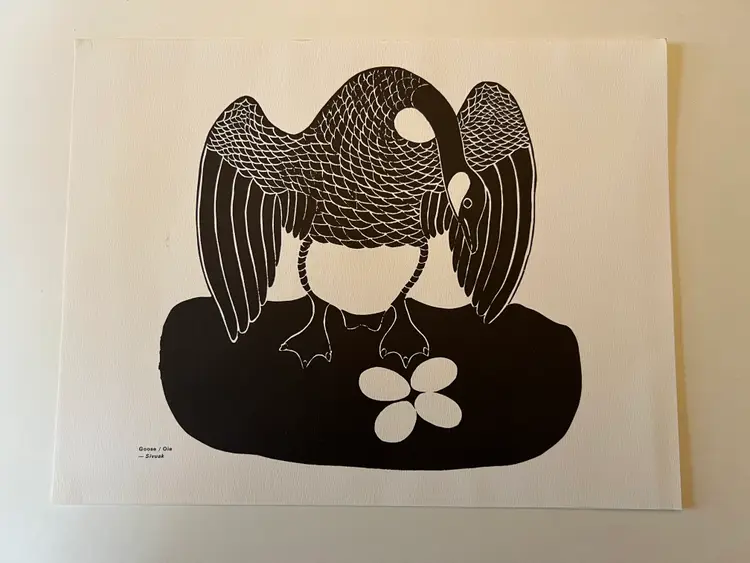 Goose/ Oie by Sivuak of the Povungnituk Cooperative. This print is from a portfolio of certified reproductions by La Fédération des Coopératives du Nouveau Quebec, published in the 1970s.