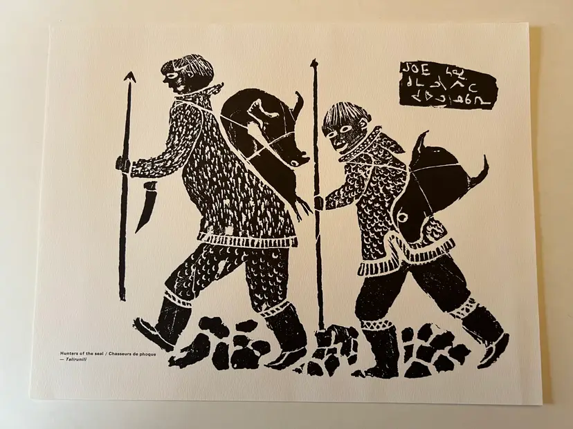 Hunters of the Seal/ Chasseures de phoque by Talirunili of the Povungnituk Cooperative. This print is from a portfolio of certified reproductions by La Fédération des Coopératives du Nouveau Quebec, published in the 1970s.