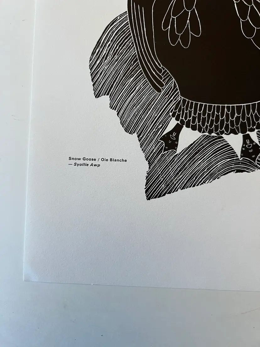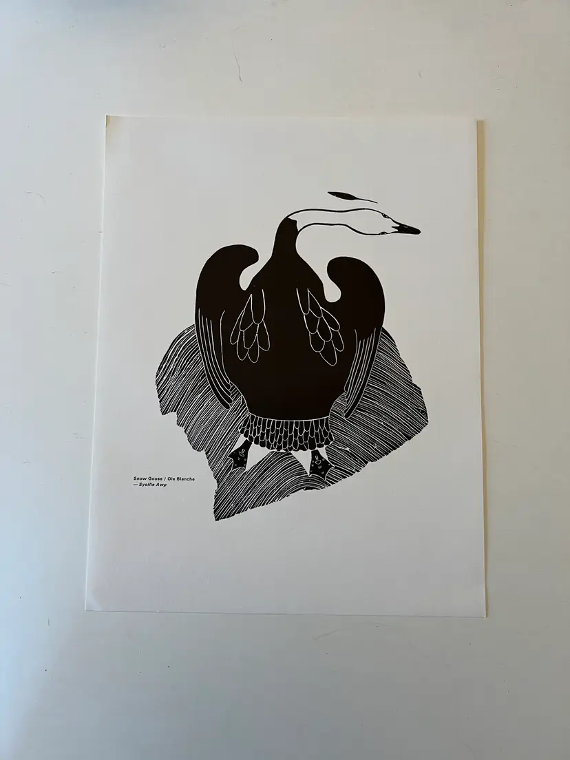 Snow Goose/ Oie Blanche by Syollie Awp of the Povungnituk Cooperative. This print is from a portfolio of certified reproductions by La Fédération des Coopératives du Nouveau Quebec, published in the 1970s.