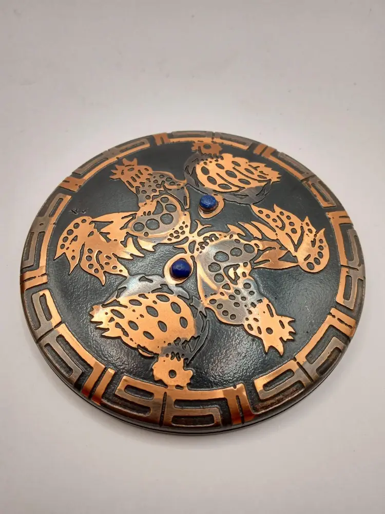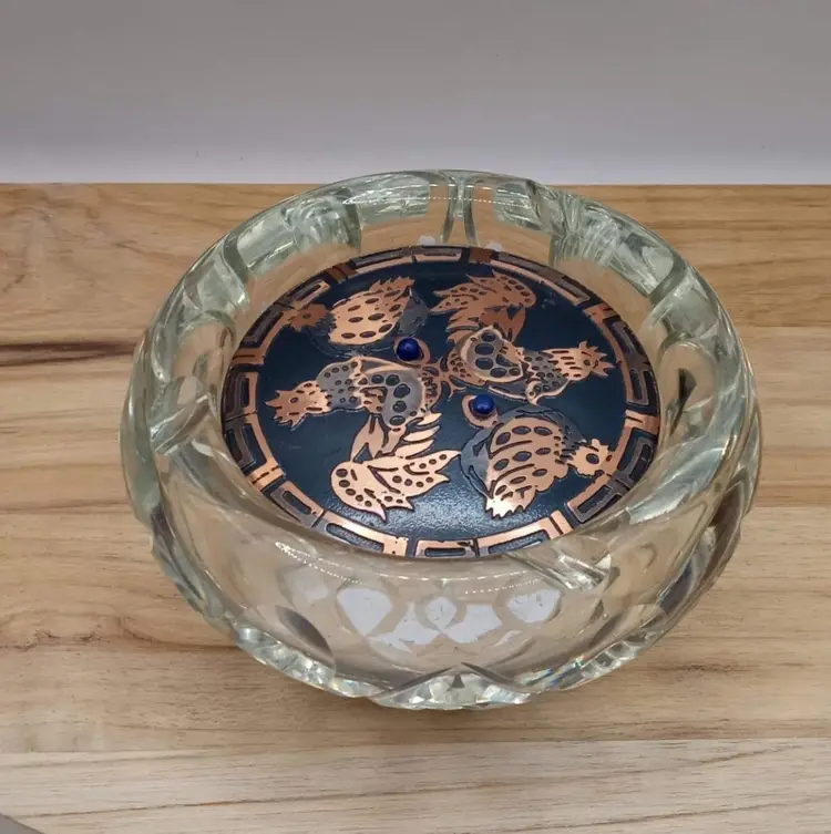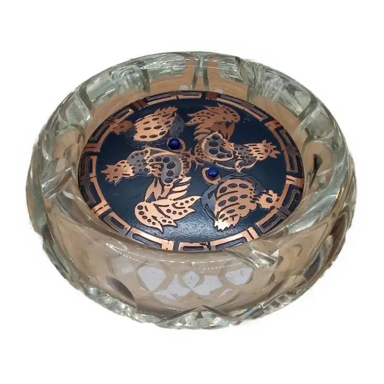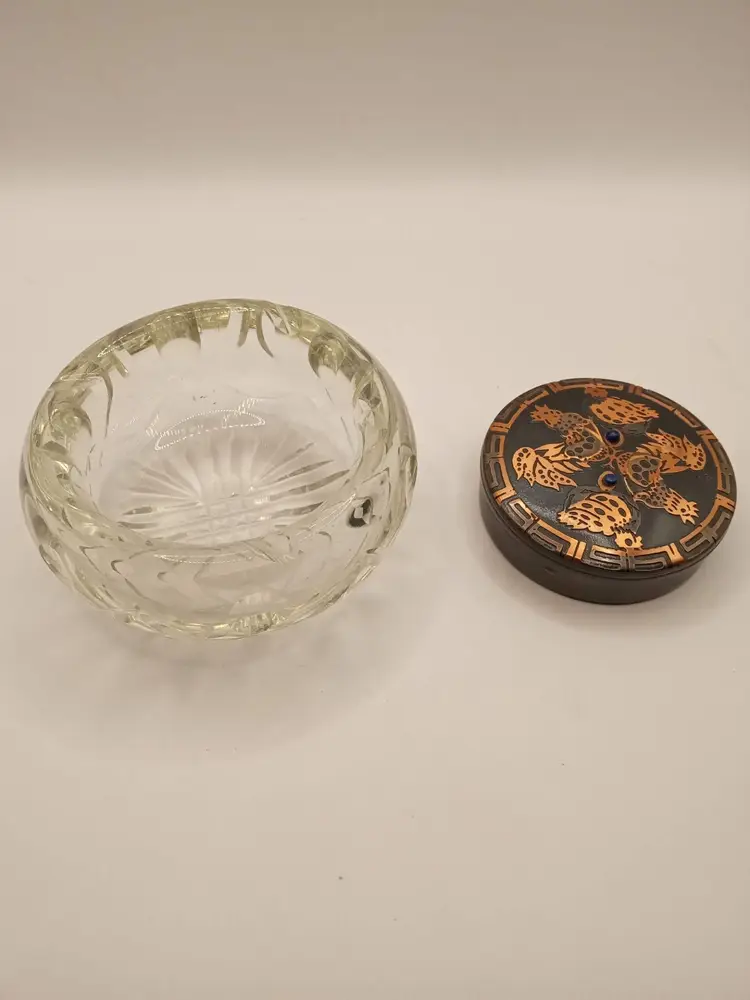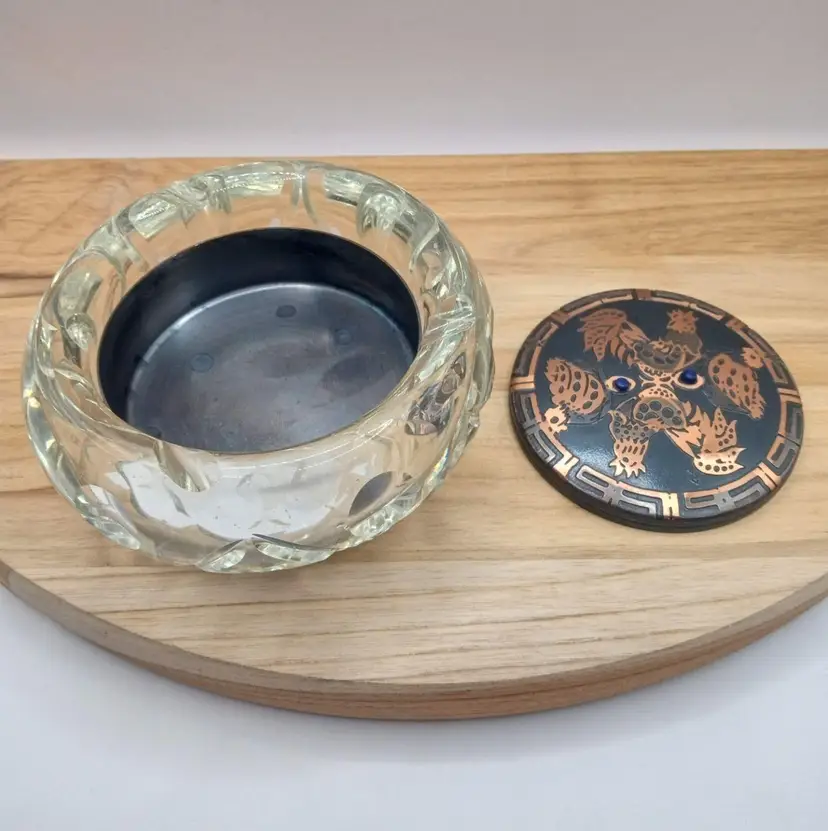 1970s Mixed Metal/Crystal Rooster and Hen Motif Incense Burner Solid Cut Crystal Base Enclosure with Engraved Mixed Metal container and Top depicting 2 roosters and 2 hens complete with Blue cabochon eggs. I believe this to be made in Japan.
