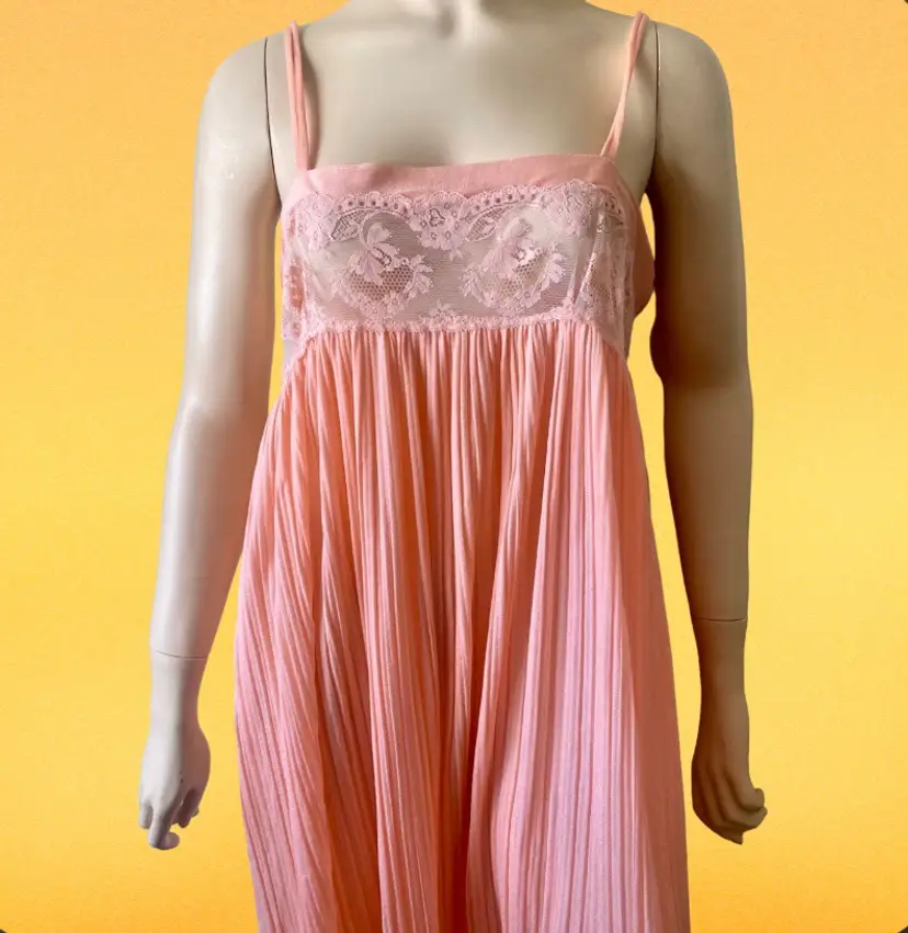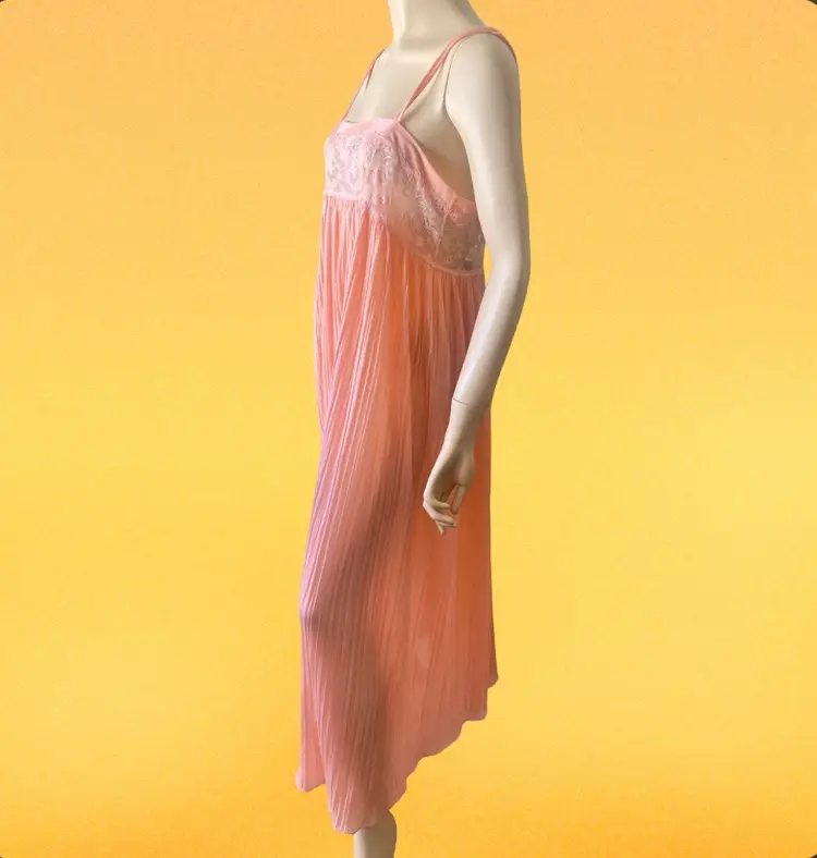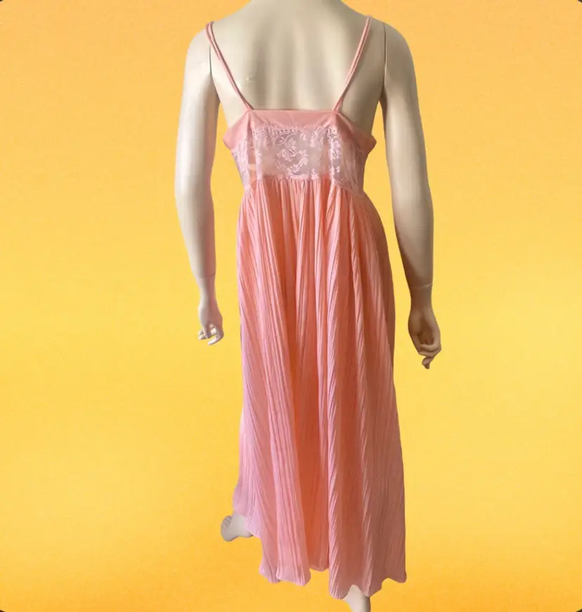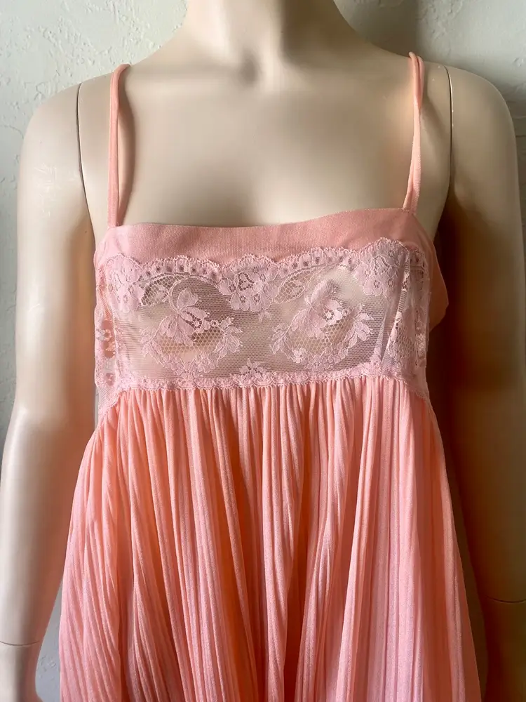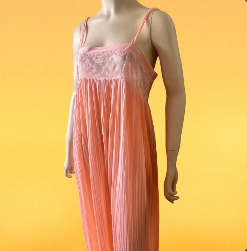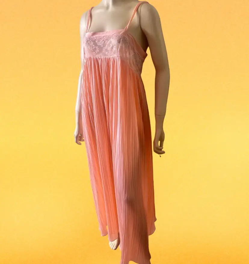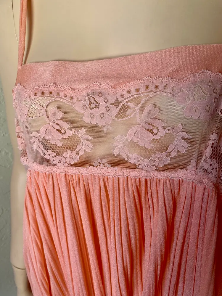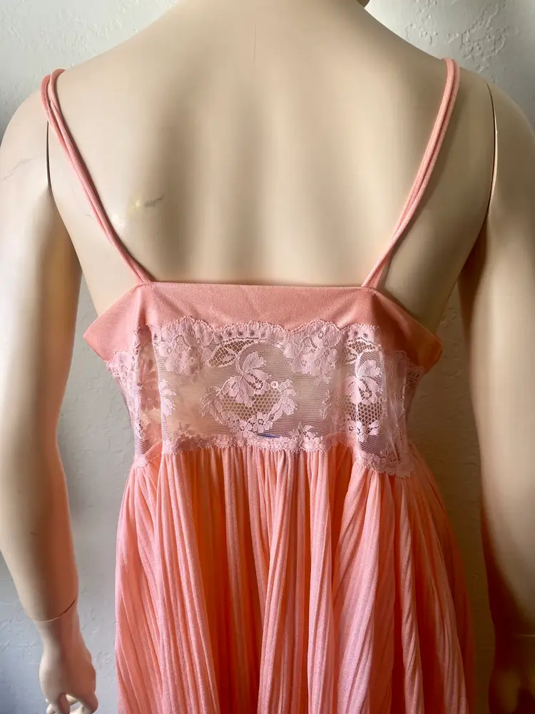 1970s Peach Grecian Pleated Lace Maxi Nightgown