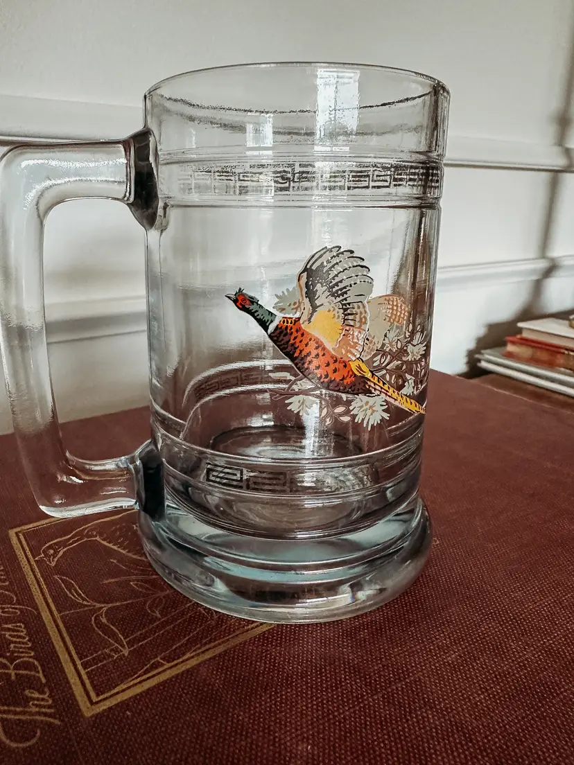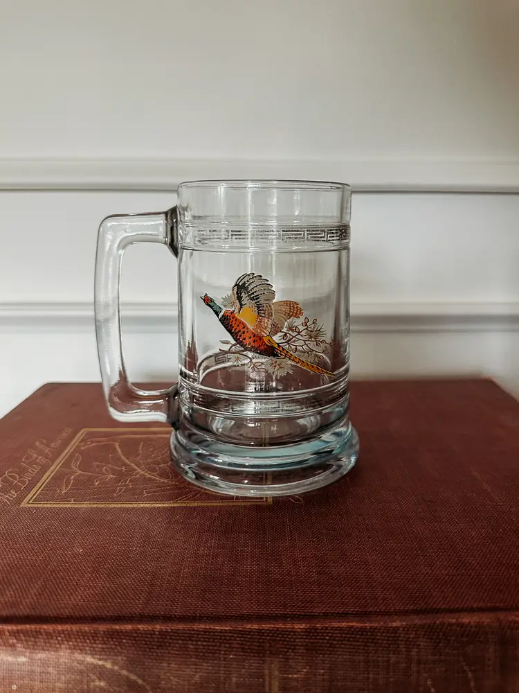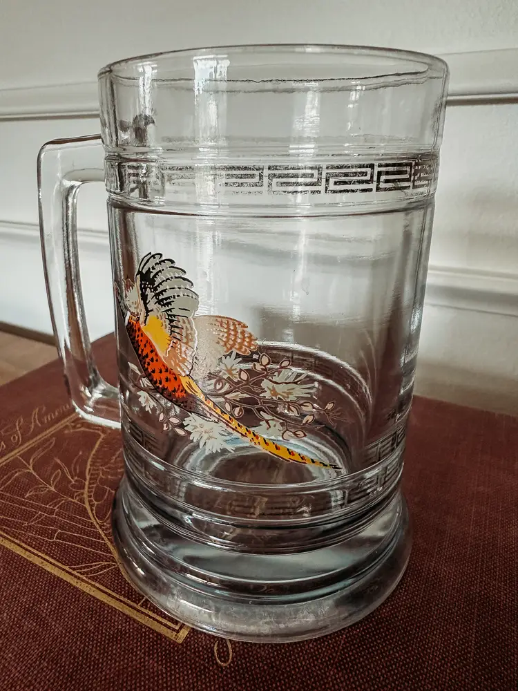Beautiful collectors Beer Mug feature a Greek key design and colorful pheasant. The key design is slightly faded but the pheasant it vibrant! Perfect gift for a hunter or to add to your fall collection! Measures 5 by 4.5 by 3.75 inches