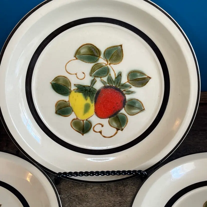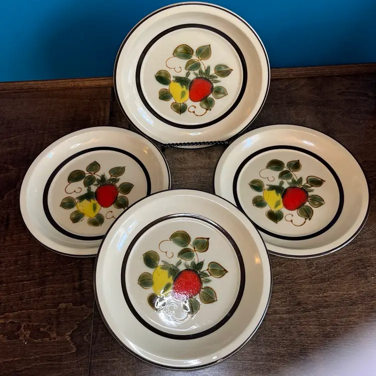 These are so fun! I am actually amazed at the condition of these vintage plates. They have almost no utensils marks and very little ware at all. One plate does have a small blemish one the rim but it was done in the manufacture process. See pic. They are free of any chips or cracks.