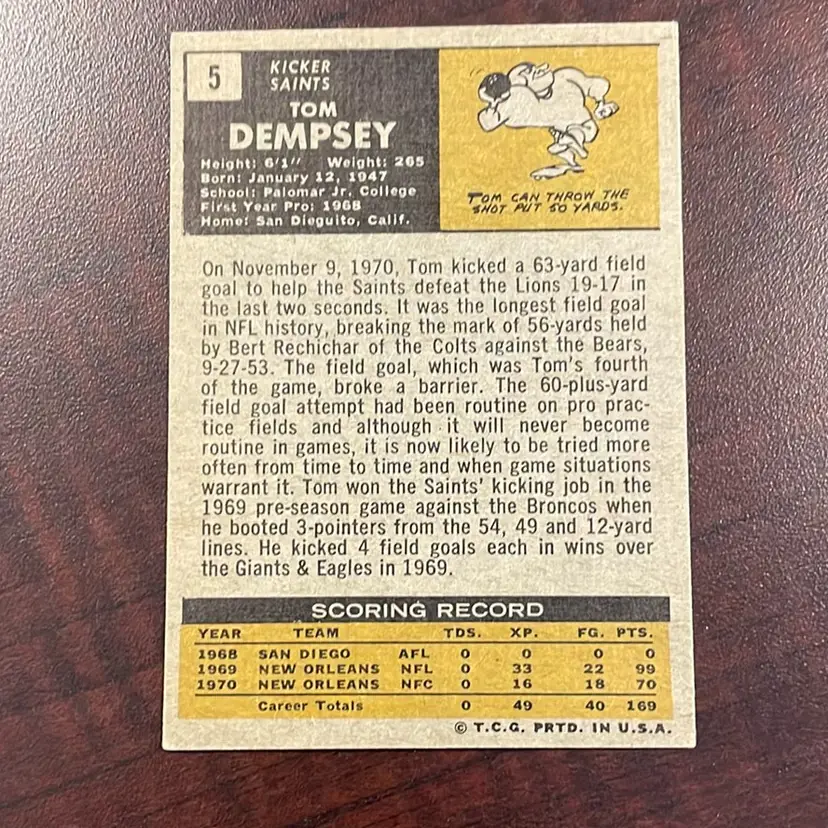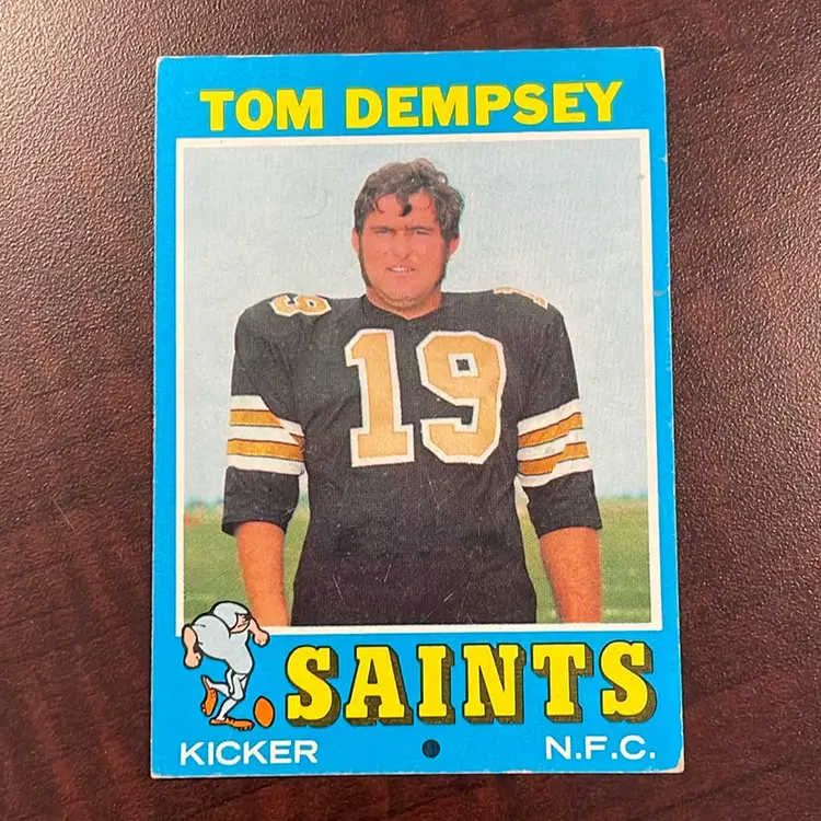 1971 Topps Tom Dempsey. The corners are dinged. Take a look at the pictures for more details.