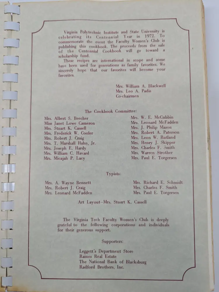1972 Virginia Tech Faculty Women's Club Centennial Cookbook