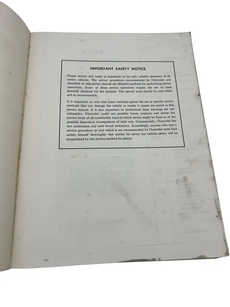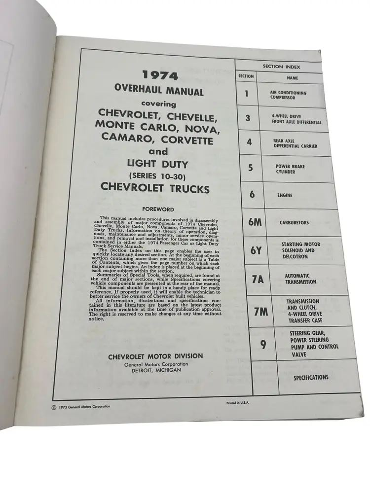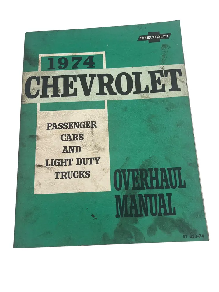 Factory 1974 Chevrolet Overhaul Manual ST-333-74, covering passenger cars (Chevelle, Camaro, Nova, Corvette, etc.) and light-duty trucks (series 10-30). Measures approximately 11″ × 8.25″.