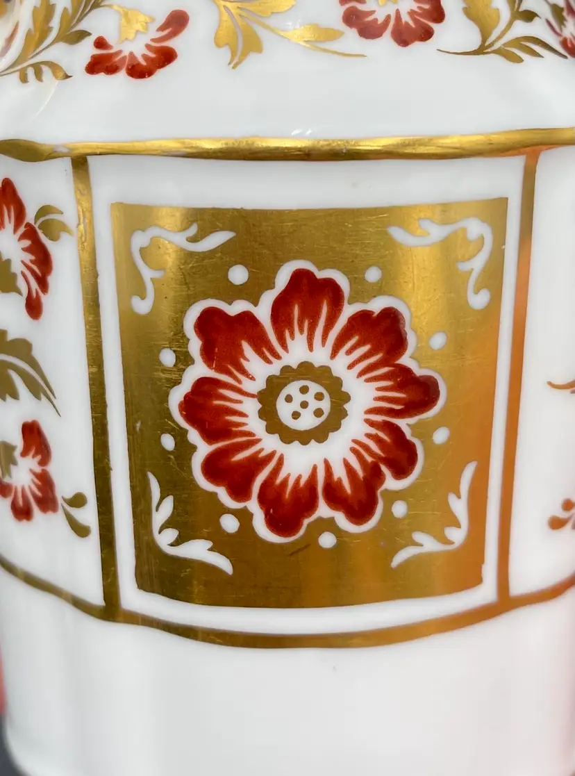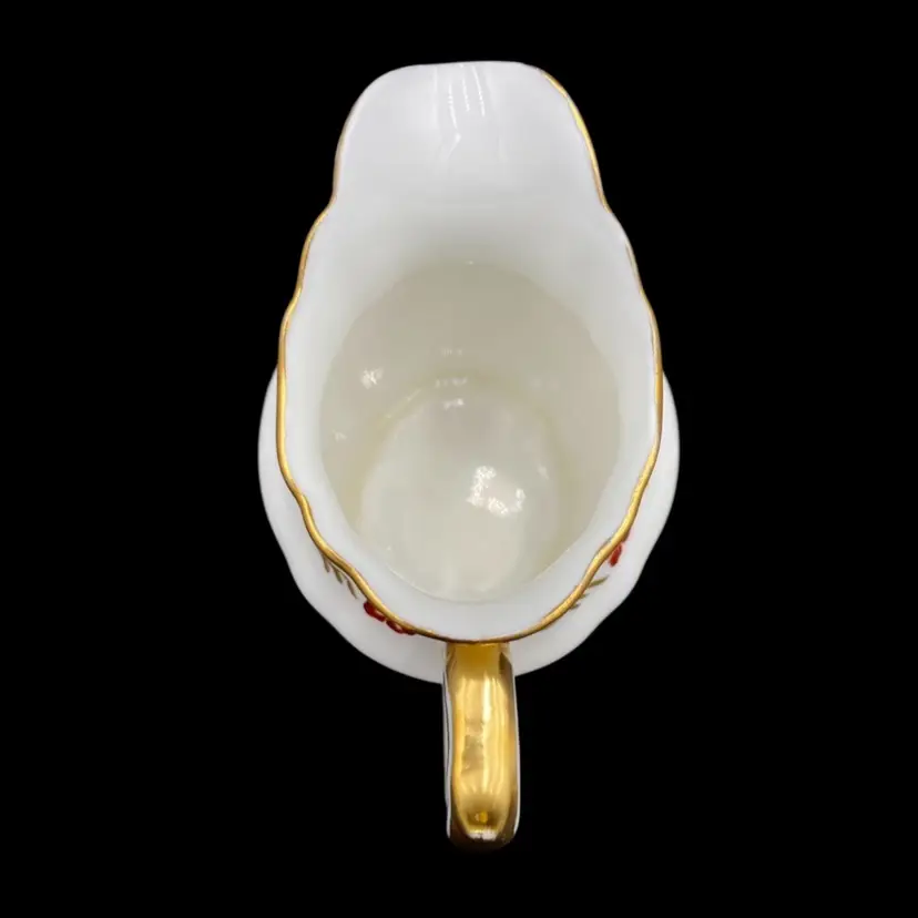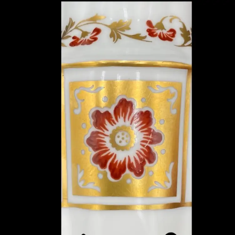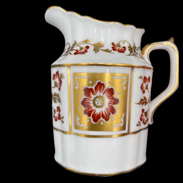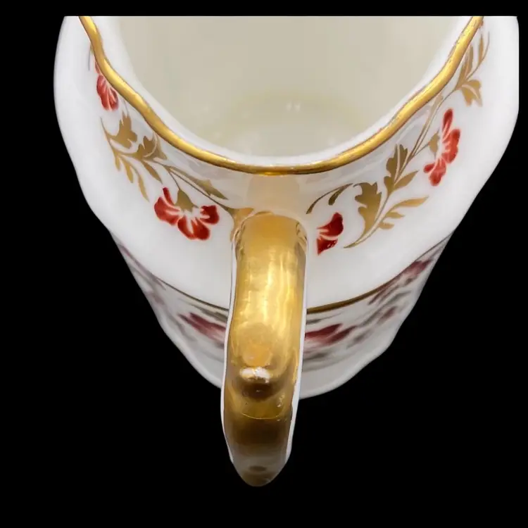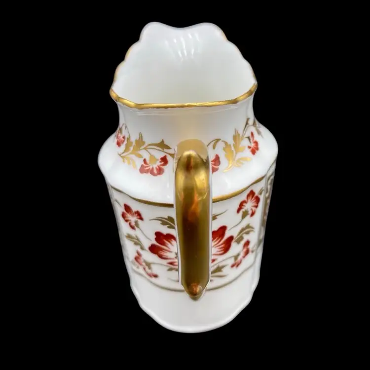 The creamer has no chips or cracks. There are three spots to mention, each captured in a close-up picture. With the handle in your right hand, the red flower has a slight white line (scratch?) through the right side of the red flower (picture 7). The gold has worn off the tip of the sculpted handle (picture 8). With the handle in your left hand, there are some tiny marks on the upper left panel of the gold surrounding the flower (last picture). The overwhelming majority of the pattern and decorative gold gilt is in excellent condition.