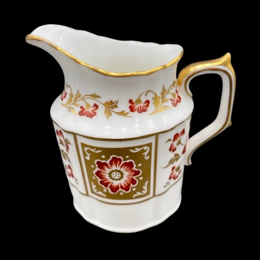 This vintage Royal Crown Derby creamer is a beautiful addition to any collection. Made in Derby, England in 1974, this creamer features the classic Red Derby Panel pattern on glossy bone china. Measuring 3.8 inches in length, 3.6 inches in height, and 2.2 inches in width, it weighs only 3.9 ounces. The creamer is in excellent used condition with a printed backstamp and is an original piece.