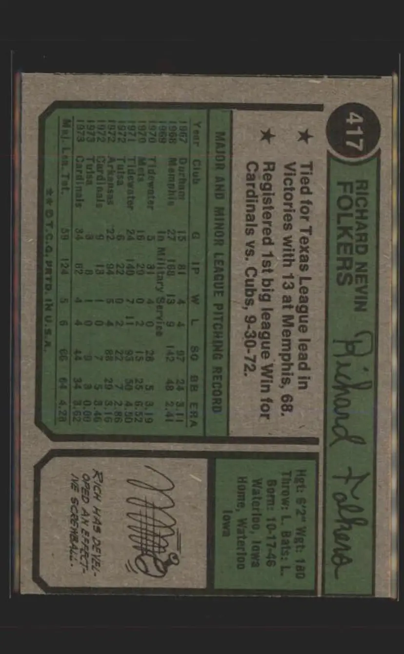 1974 Topps #417 Rich Folkers - (pk5) - St. Louis Cardinals