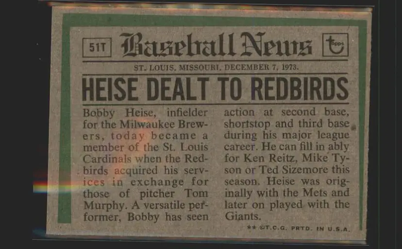 1974 Topps #51T Bobby Heise Traded - (pk2) - St. Louis Cardinals