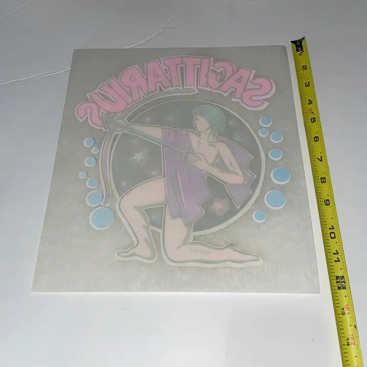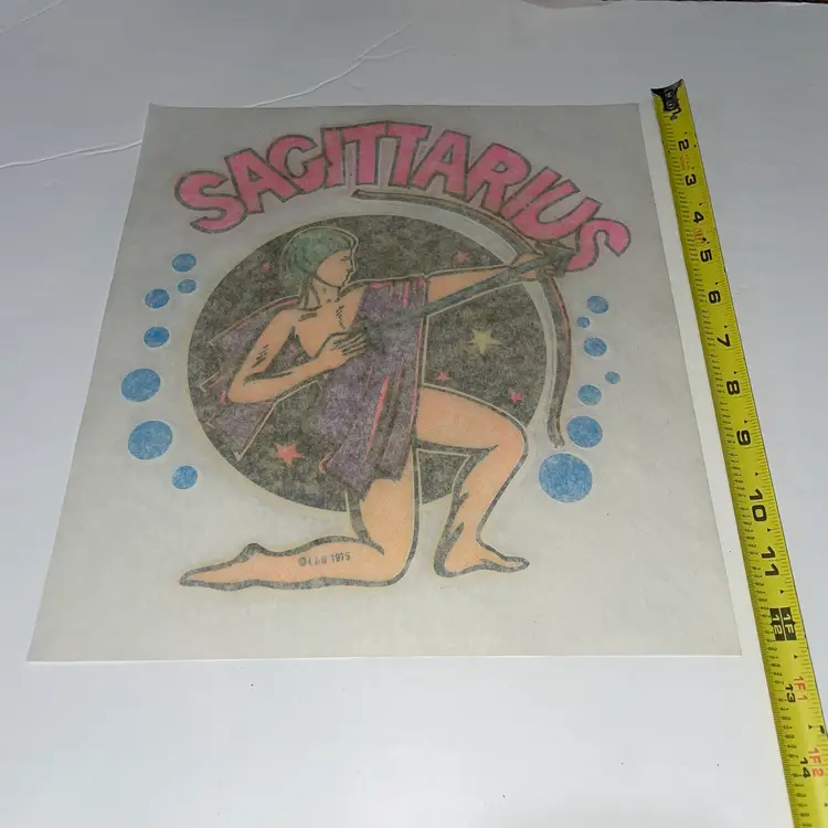 Elevate your vintage collection with this authentic 1970’s sagittarius Zodiac Sign Iron On Transfer from L&H MFG. This original piece boasts a vibrant multi-color design, perfect for adding a touch of retro flair to your wardrobe or accessories. Made in the United States, the transfer measures 13x11” and is crafted from durable iron-on material, ensuring lasting appeal and ease of application.