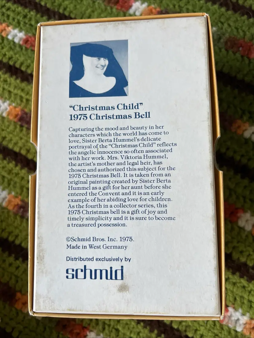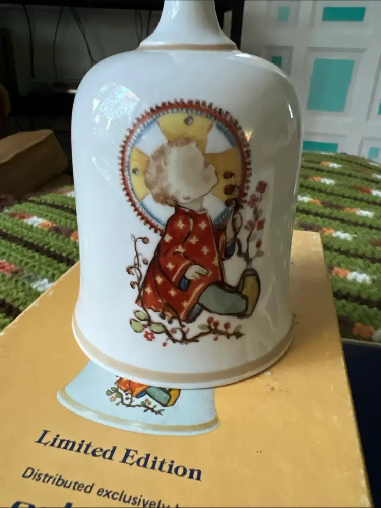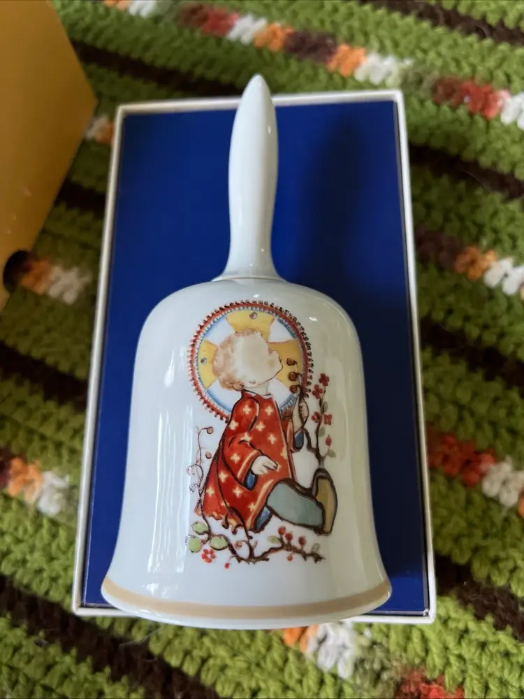 The 1975 Schmid Porcelain Christmas Bell "Christmas Child" is a limited edition collectible piece from West Germany. This bell features a festive multicolor design with a glossy finish, standing at a height of 6 inches and a width of 3 inches. The bell is part of the Fourth In Series collection and is themed around "Christmas Child", making it a special addition to any holiday decor. Made of porcelain, this bell is a unique and charming piece that captures the spirit of Christmas nostalgia.
