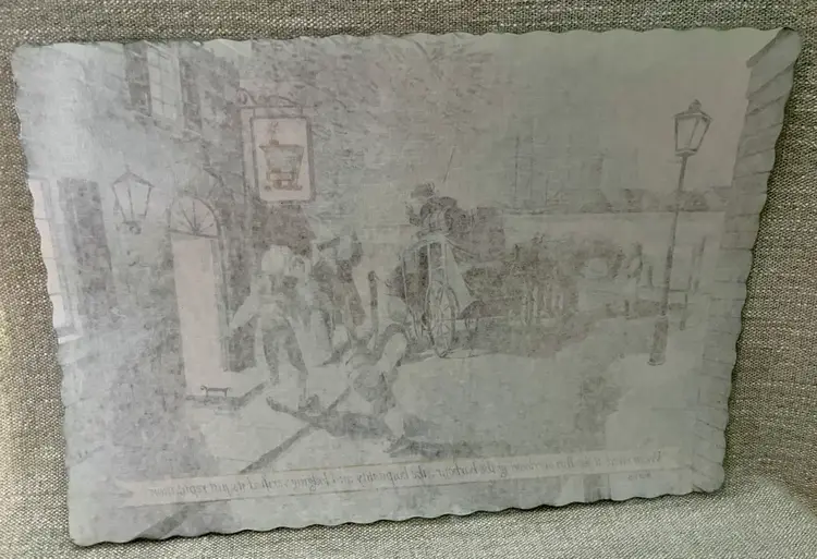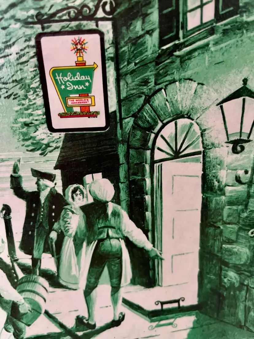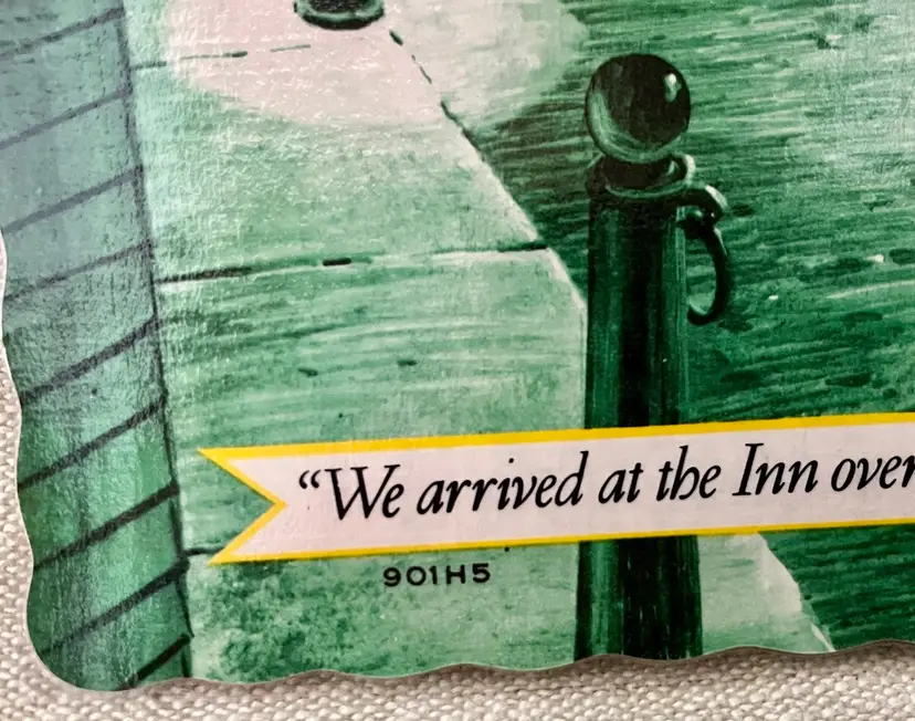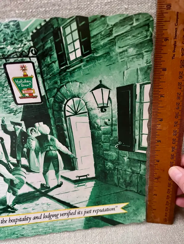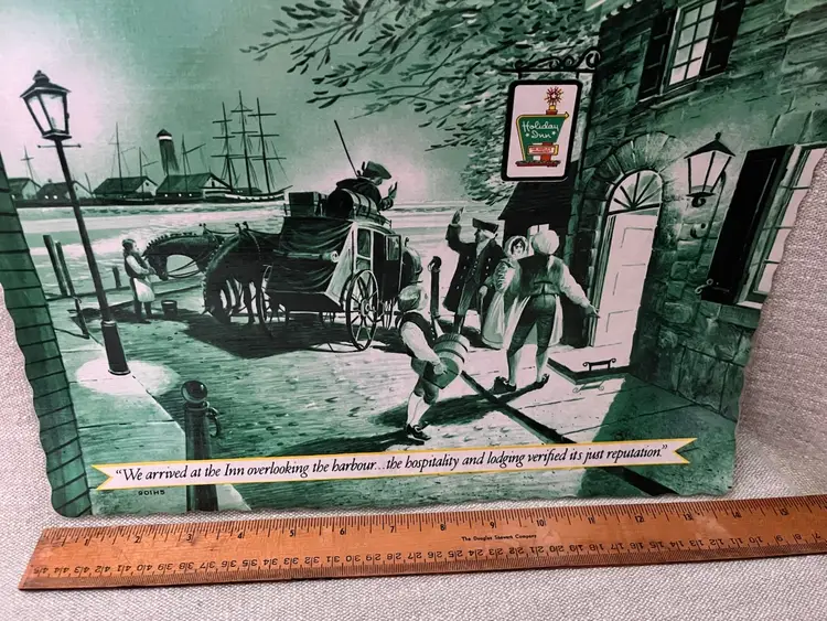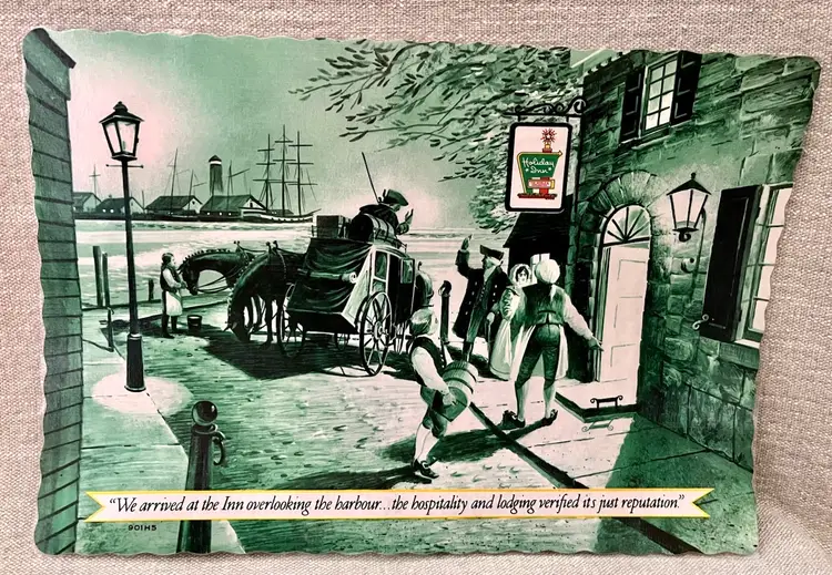 The product is a vintage 1976 Holiday Inn plastic laminate paper placemat, featuring a Colonial era arrival by stagecoach Stage Coach to the Inn with the harbor, lighthouse and Tall Ship 3-masted Barque in the background. This original diner placemat bicentennial era theme of restaurants and fast food advertising, making it a unique and collectible piece for those interested in nostalgic memorabilia. “We arrived at the Inn overlooking the harbour….the hospitality and lodging verified it’s just reputation”. No# 901H5