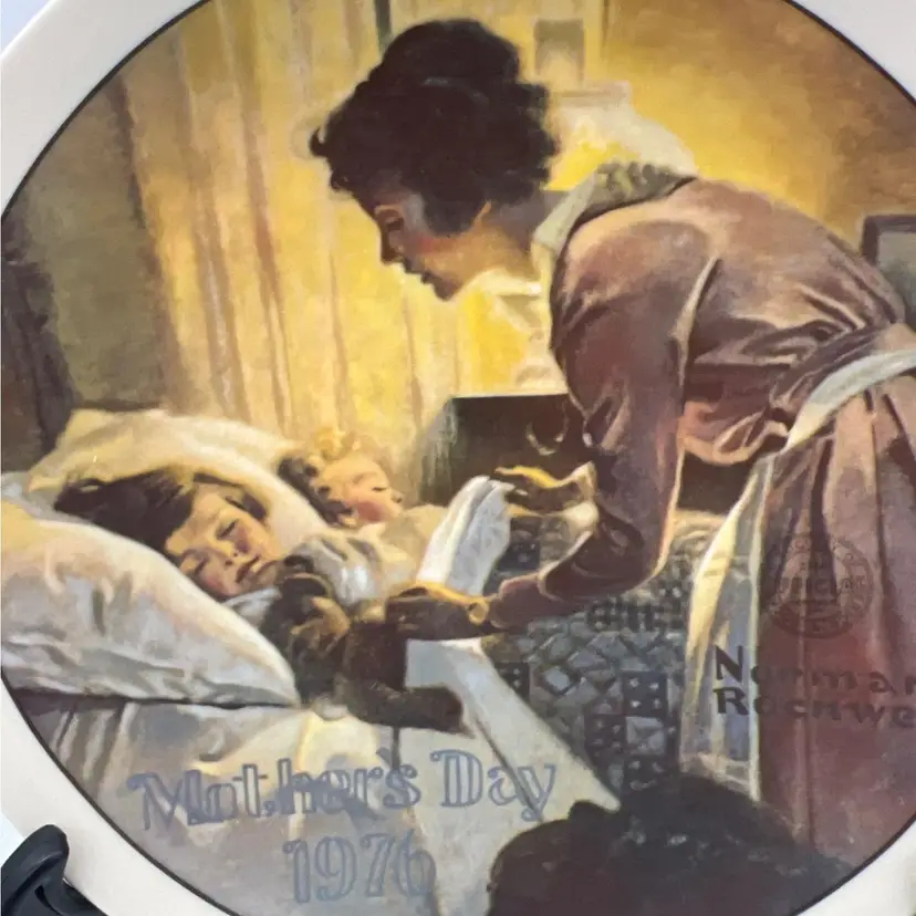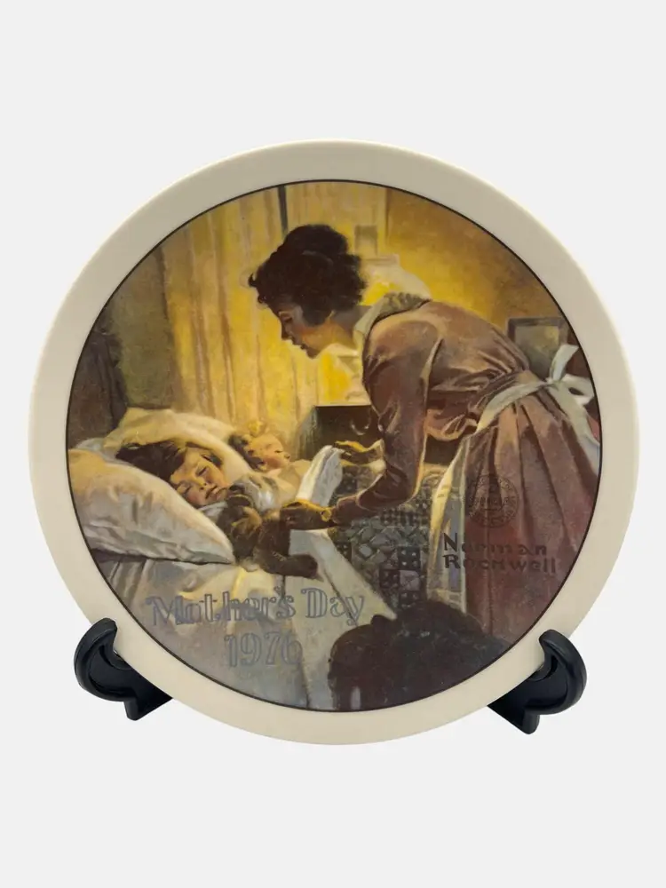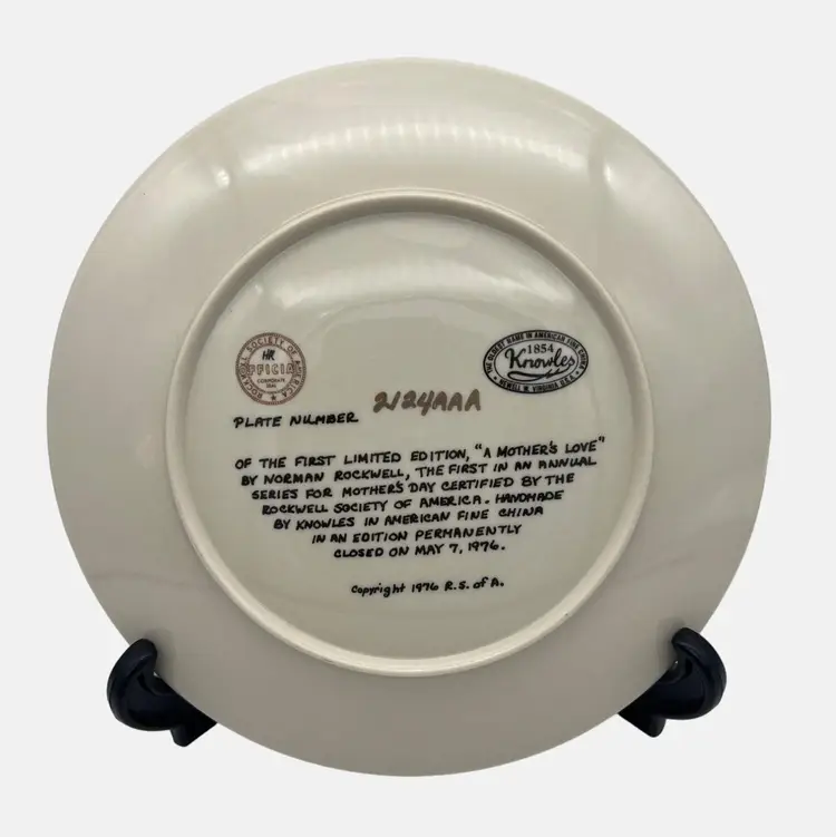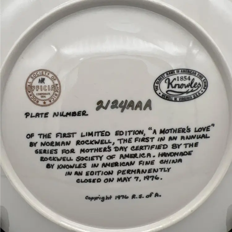 Vintage 1976 Limited Edition Norman Rockwell Mother's Day porcelain collectible plate from Edwin M. Knowles. The title of the painting is "A Mother's Love". The plate measures approximately 8.5" across.