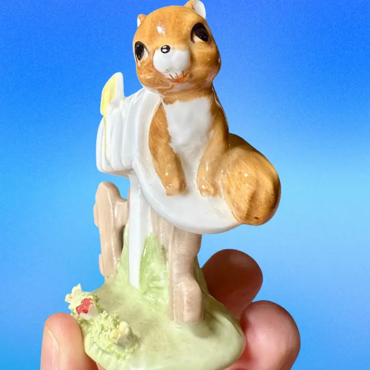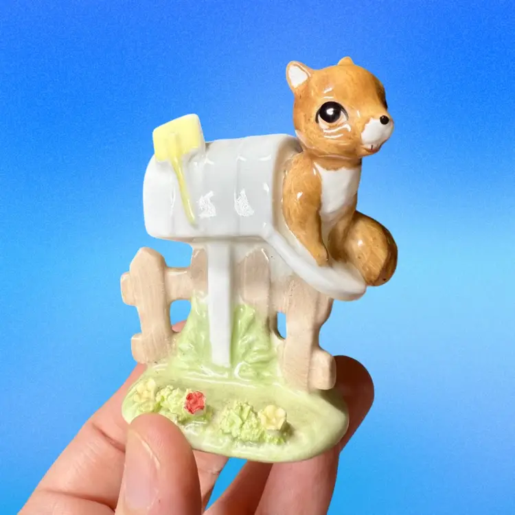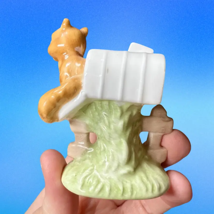 3”x2”. Adorable bone china figurine of a squirrel peeking out of a mailbox. No issues! Has stamp on bottom.