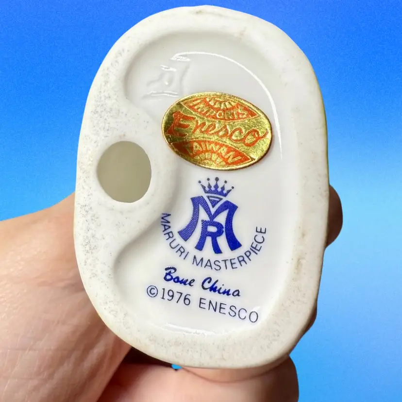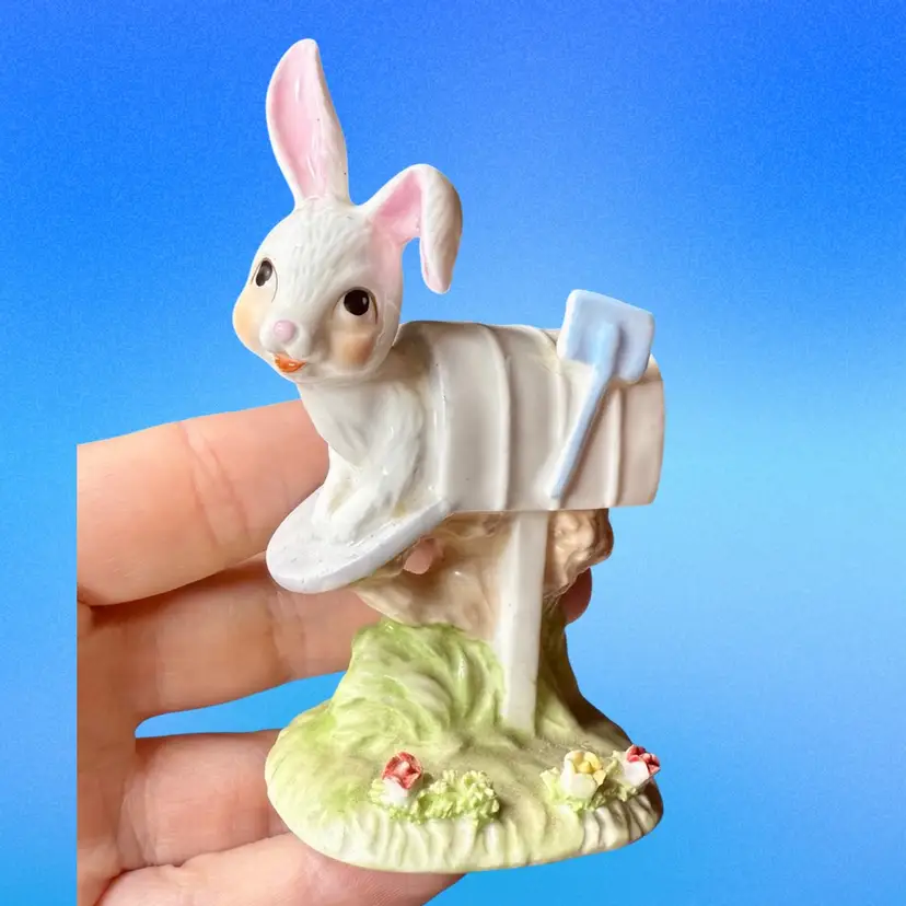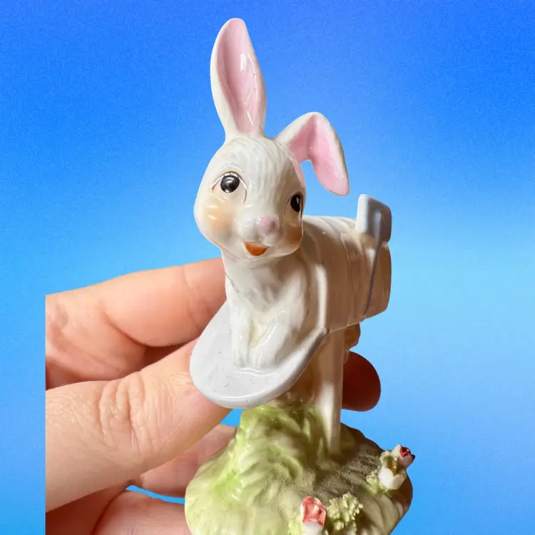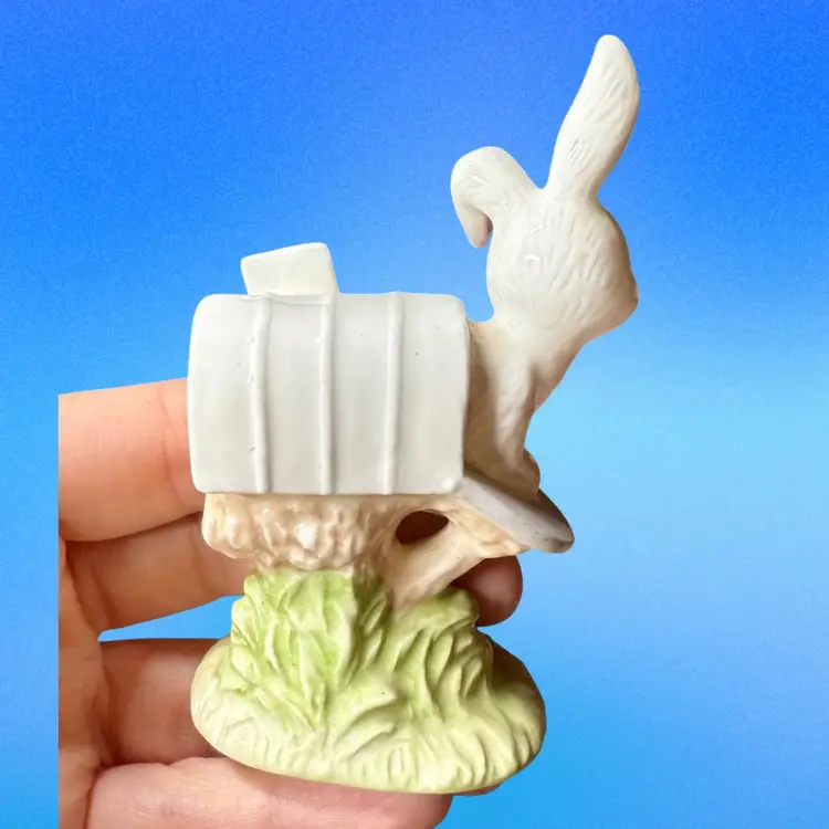3.5”x2”. Sweet bone china white rabbit peeking out of a mailbox. Has stamp and Enesco sticker on bottom. No issues.