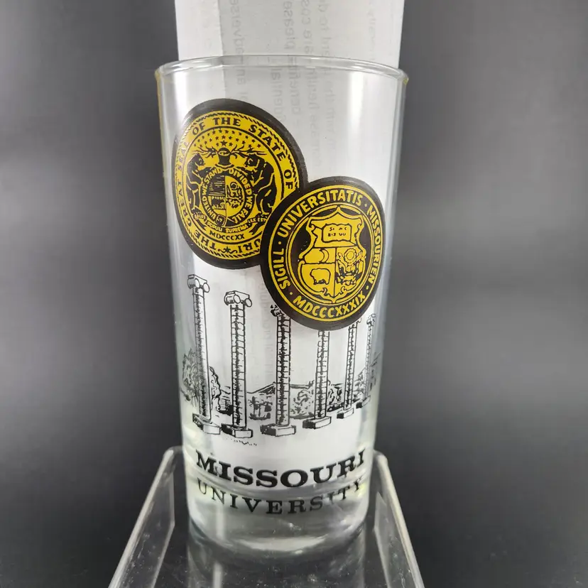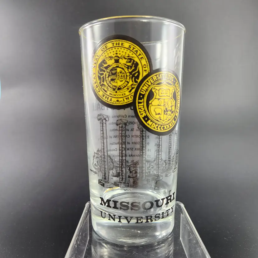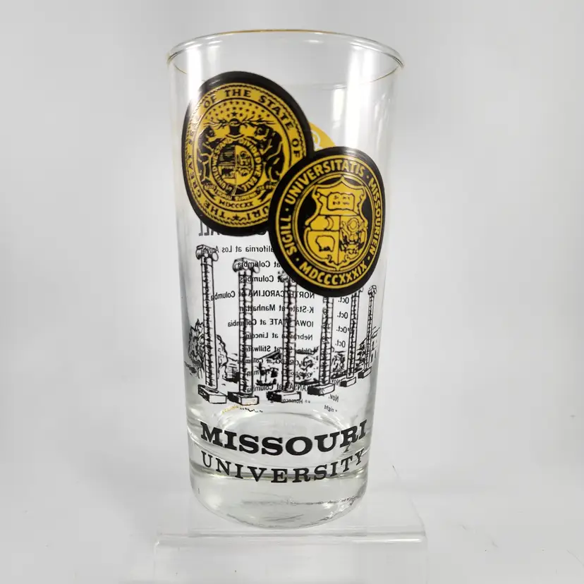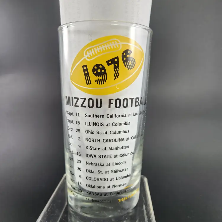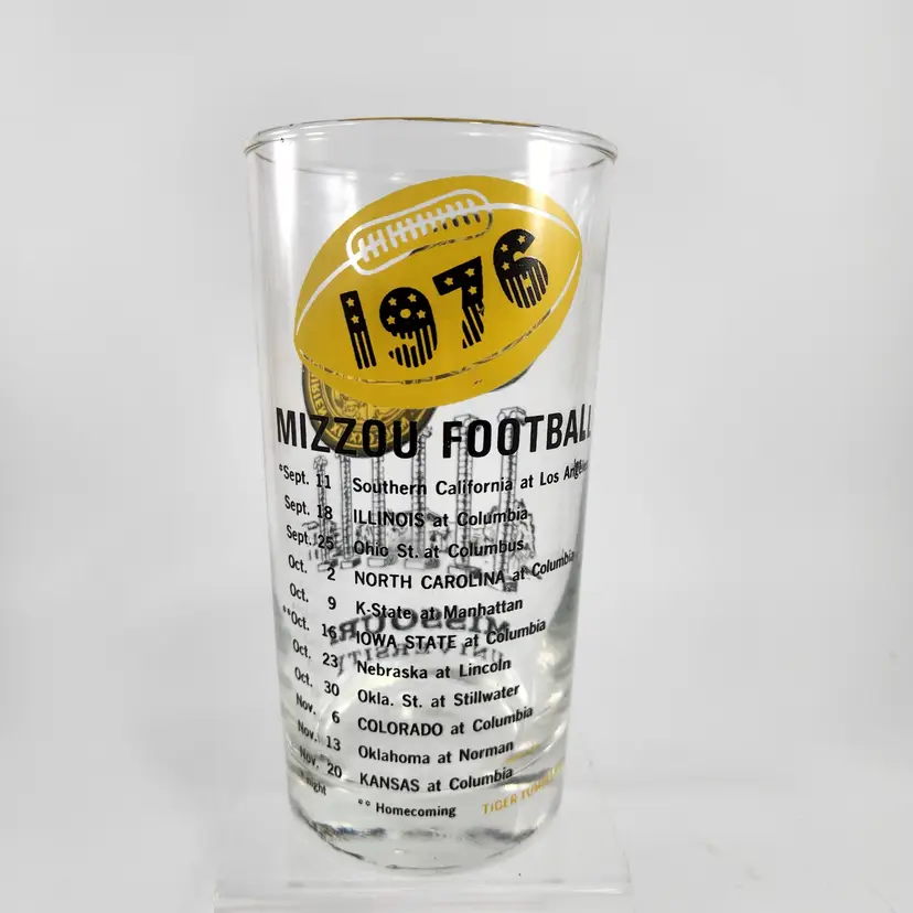 Rare! Perfect gift for a sports enthusiast/ alumni. USA made 1976 University of Missouri / Mizzou Tigers college football drinking glass tumbler for beer, water or your favorite beverage. Custom made for the school these feature the state & university seal on one side and the game schedule on the other. In yellow & black school colors. I have two of these left as of this listing.