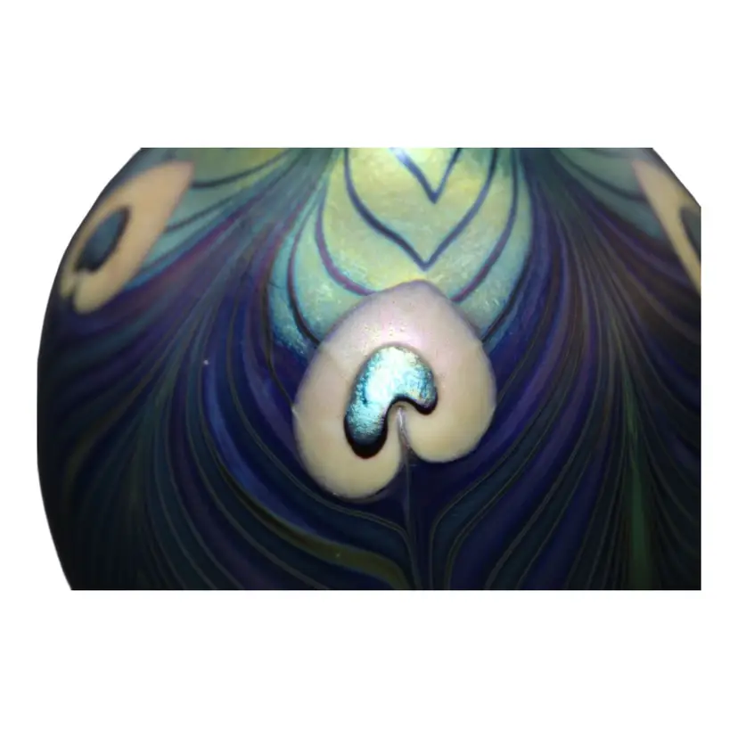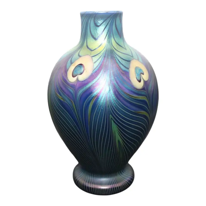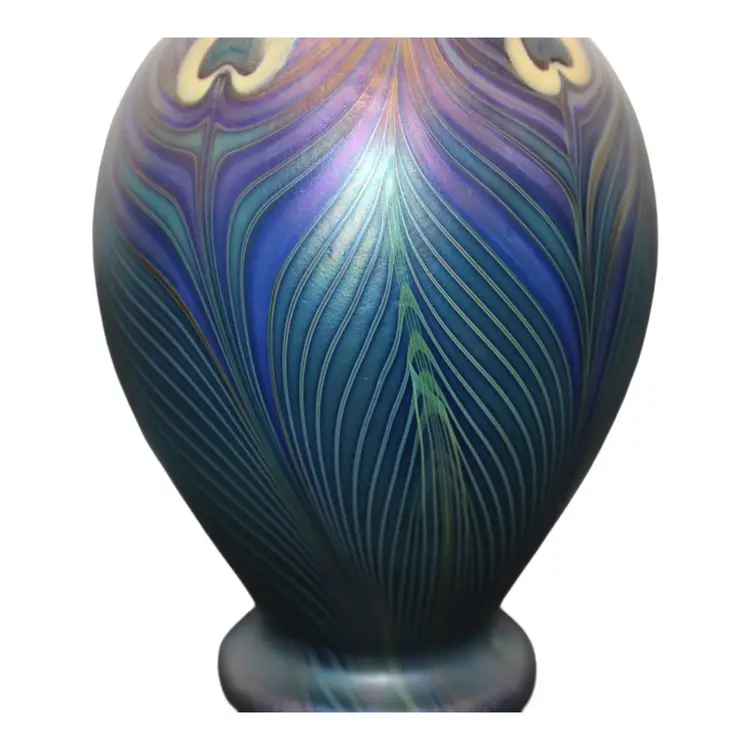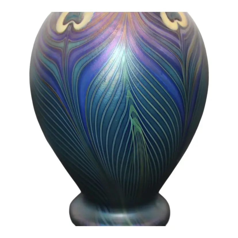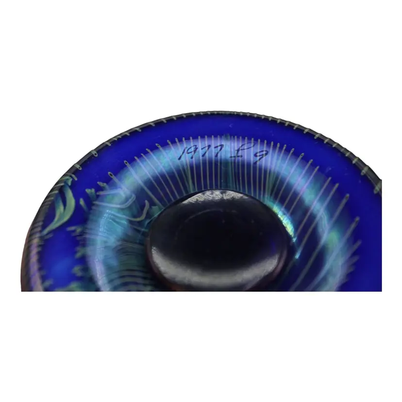 1977 Orient & Flume F9 Peacock Pulled Feather Cobalt Blue Vase 7 1/2” Tall, opening is 1 1/2” and base is 2 3/4”. No chips or cracks. Some minimal wear due to age. Please see all pictures for condition.