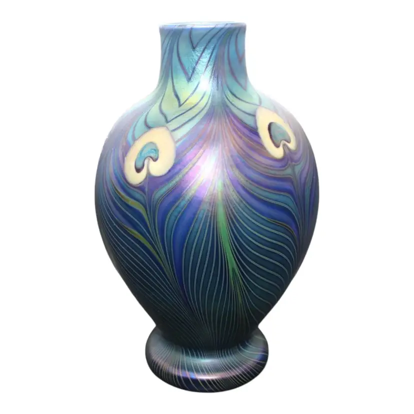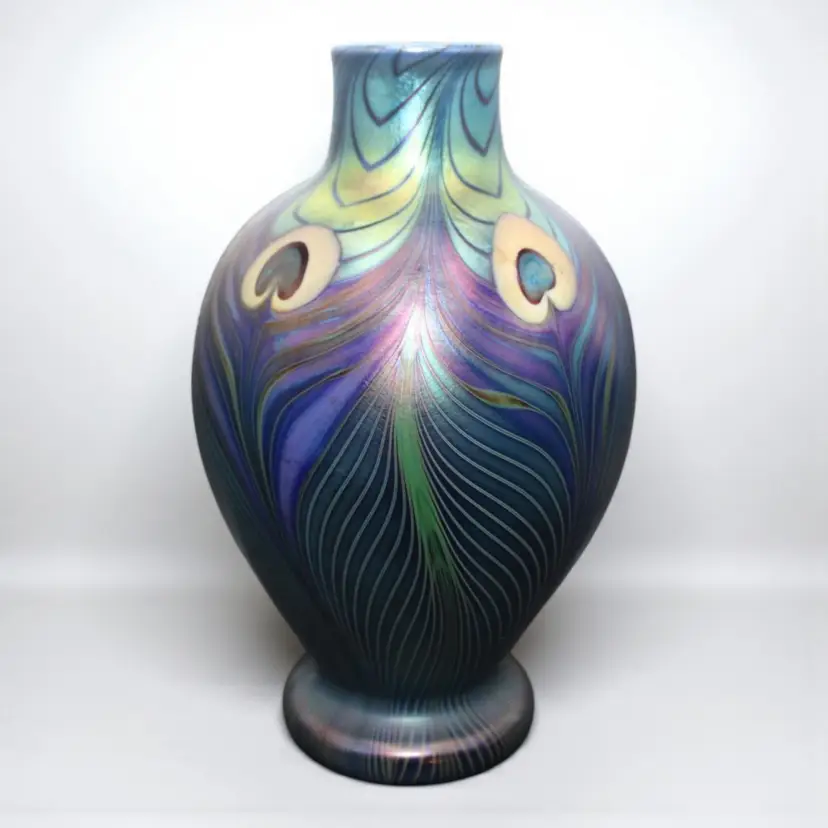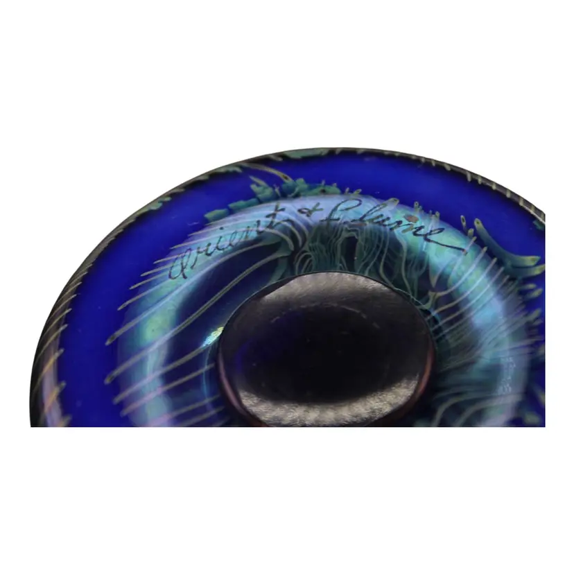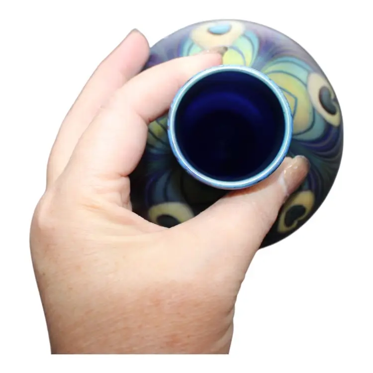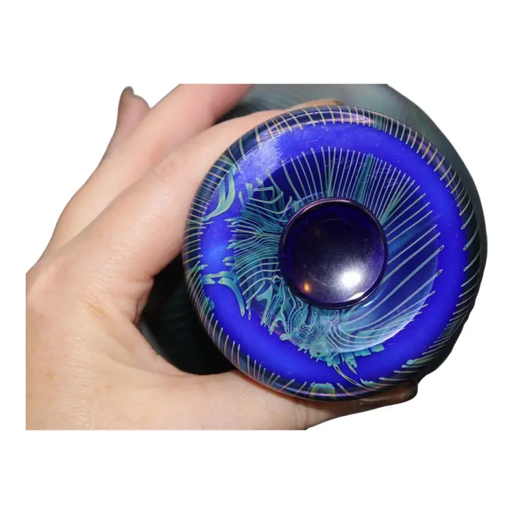 1977 Orient & Flume F9 Peacock Pulled Feather Cobalt Blue Vase 7 1/2” Tall, opening is 1 1/2” and base is 2 3/4”. No chips or cracks. Some minimal wear due to age. Please see all pictures for condition.