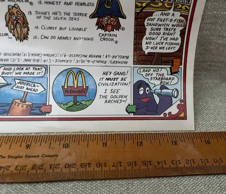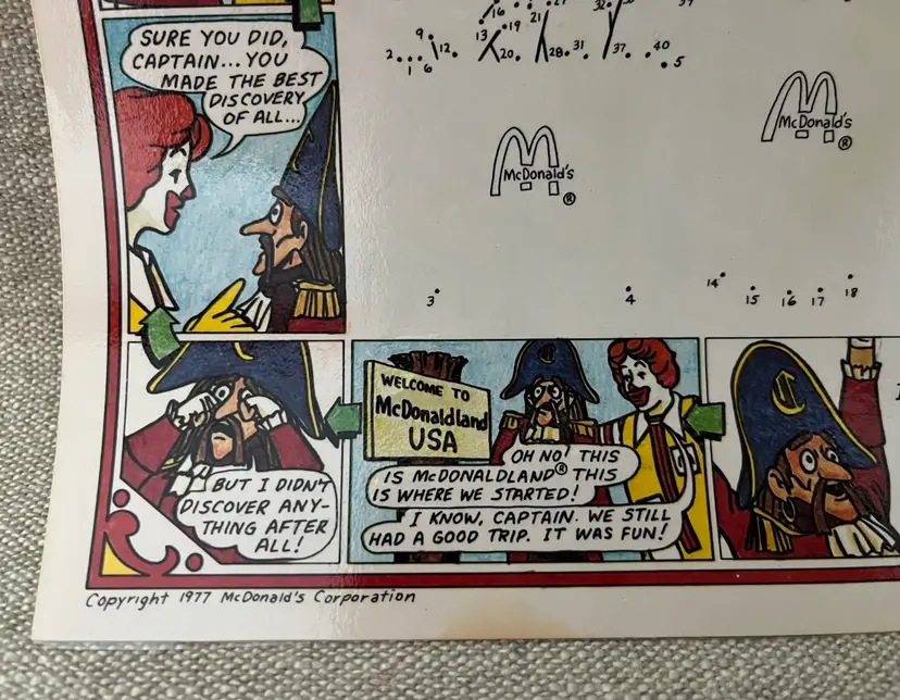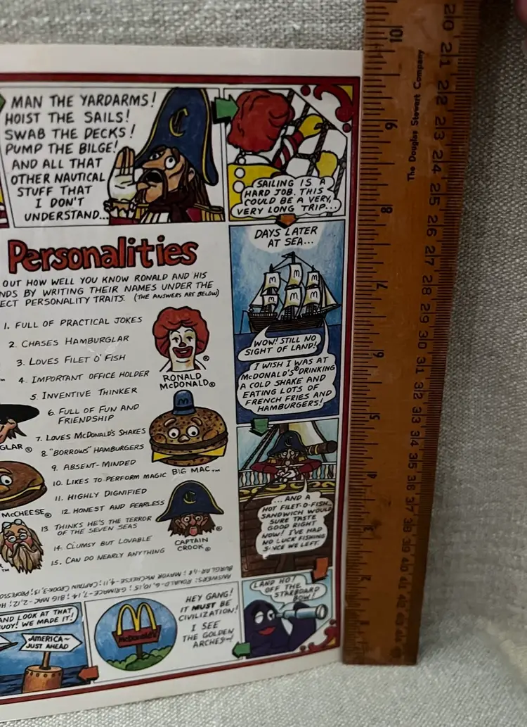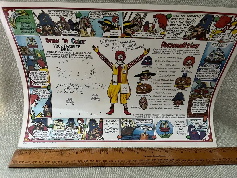 This a 1977 Ronald McDonald Corp activity paper plastic laminate placemat featuring Captain CROOK. This original advertising ephemera piece from McDonald's is a collectible item showcasing the fast-food giant's tie-in with safety education. Made in the United States, the placemat combines paper covered in a thin plastic laminate, making it a unique and nostalgic piece for collectors interested in restaurants and fast-food memorabilia or as a PROP.