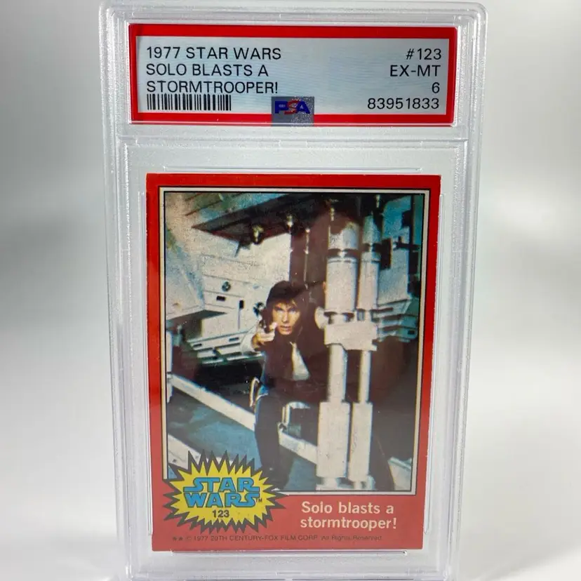 Vintage 1977 Star Wars Solo Blasts A Stormtrooper! Trading Card PSA 6 EX-MT. Cert # 83951833. Series 2 Red Series. The item in the photos is the exact item you will receive. Please see all photos and don’t hesitate to contact me with any questions. Sold as seen in the photos
