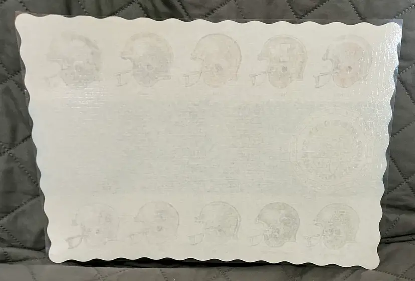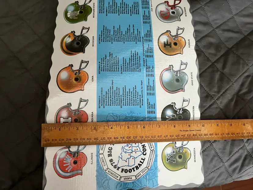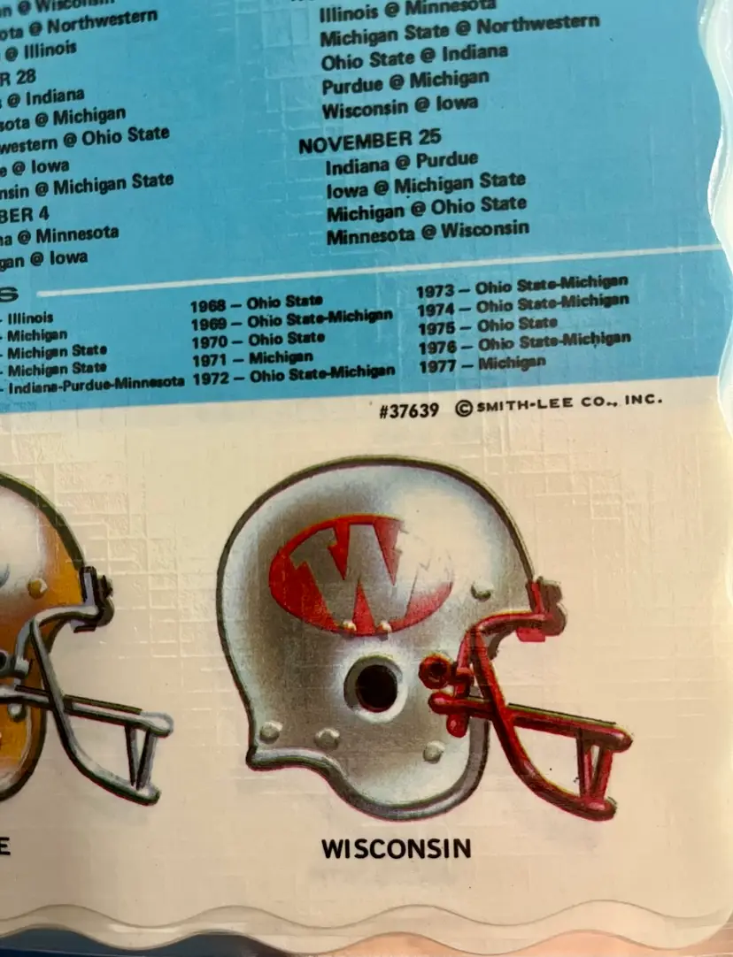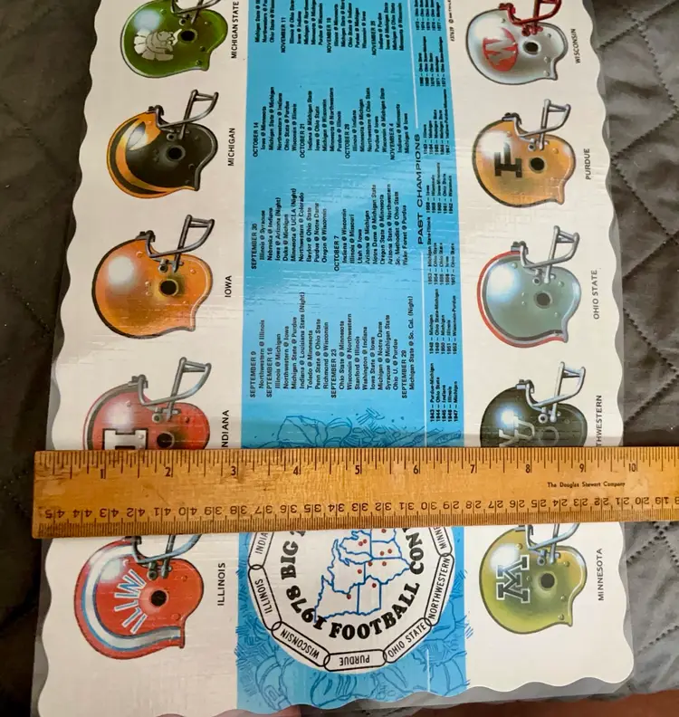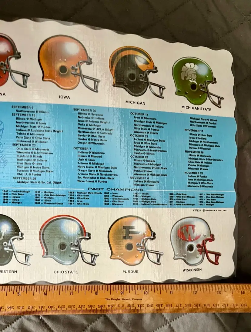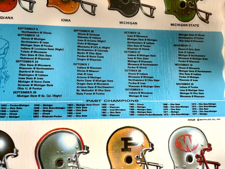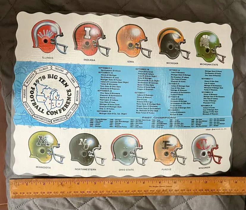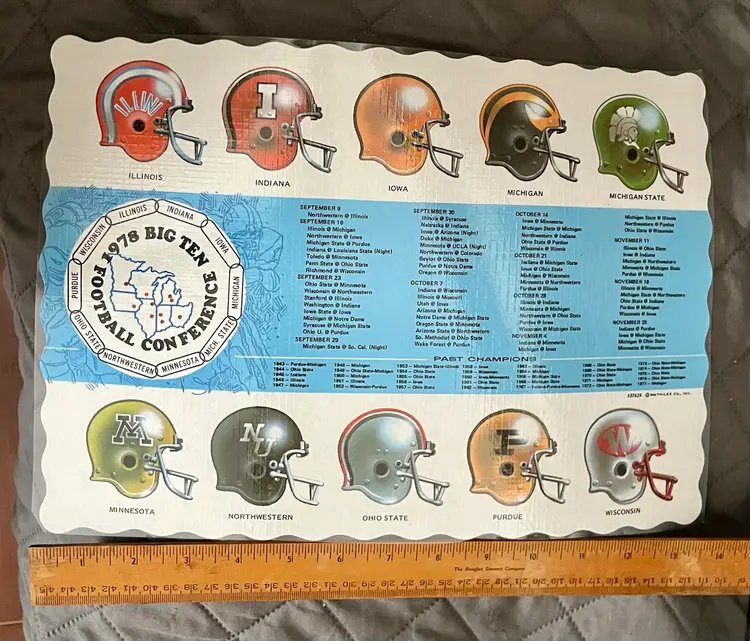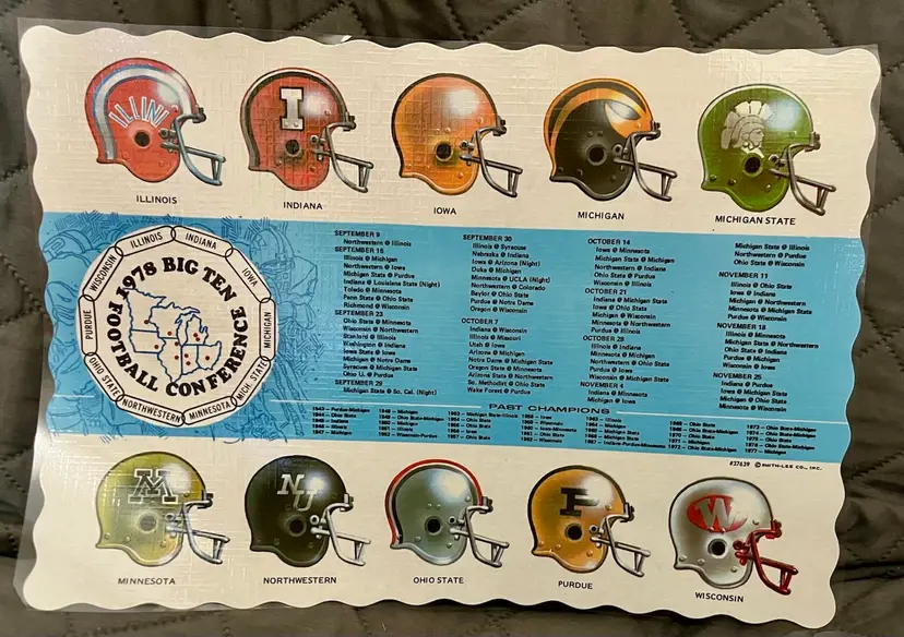 This a vintage SINGLE 1978 Big Ten Football Conference Schedule Paper with a plastic laminate placemat featuring past champions and game schedules for Illinois, Indiana, Iowa, Michigan, Michigan State, Minnesota, Northwestern, Ohio, Purdue, Wisconsin. The original placemat #37639 is by Smith-Lee Co., Inc., United States and showcases the top teams from the conference. This collectible item is a great piece of NCAA football history for fans and collectors alike.