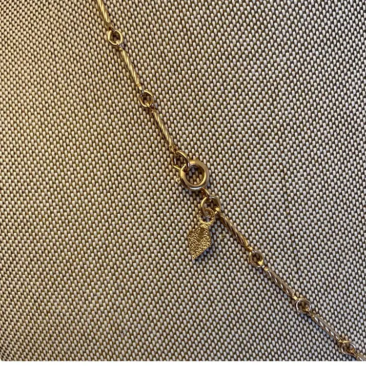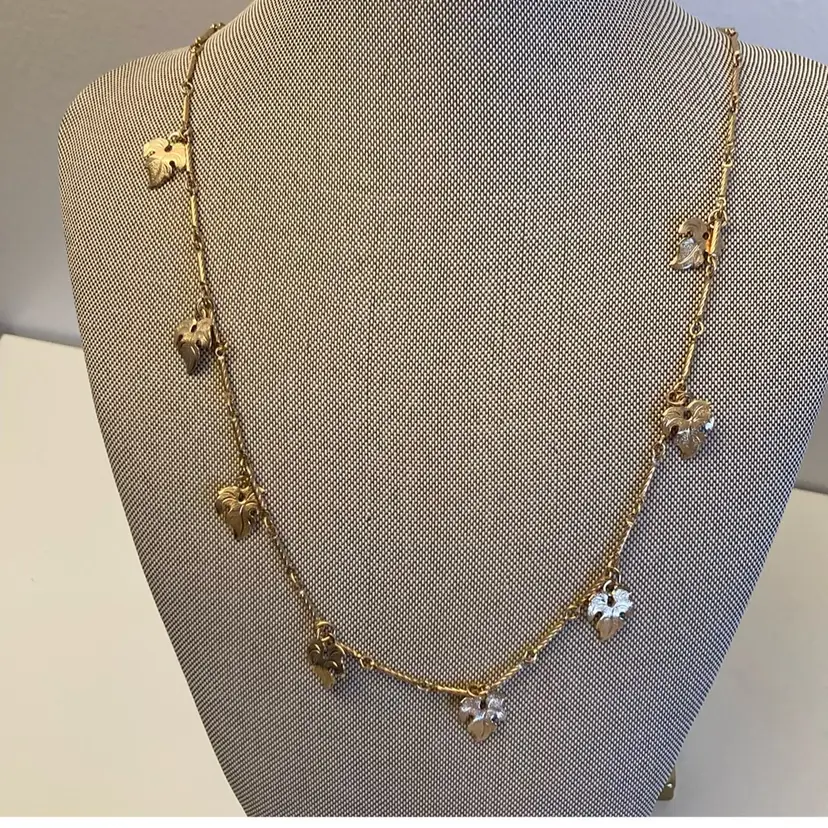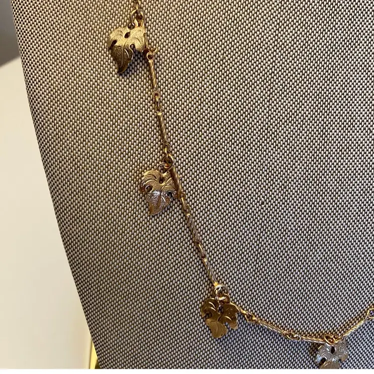 1978 Sarah Coventry New Seasons gold tone necklace featuring maple leaf charms. Length measures 23” with spring clip closure.