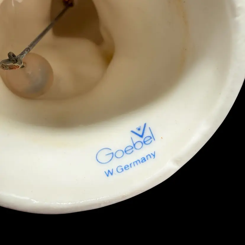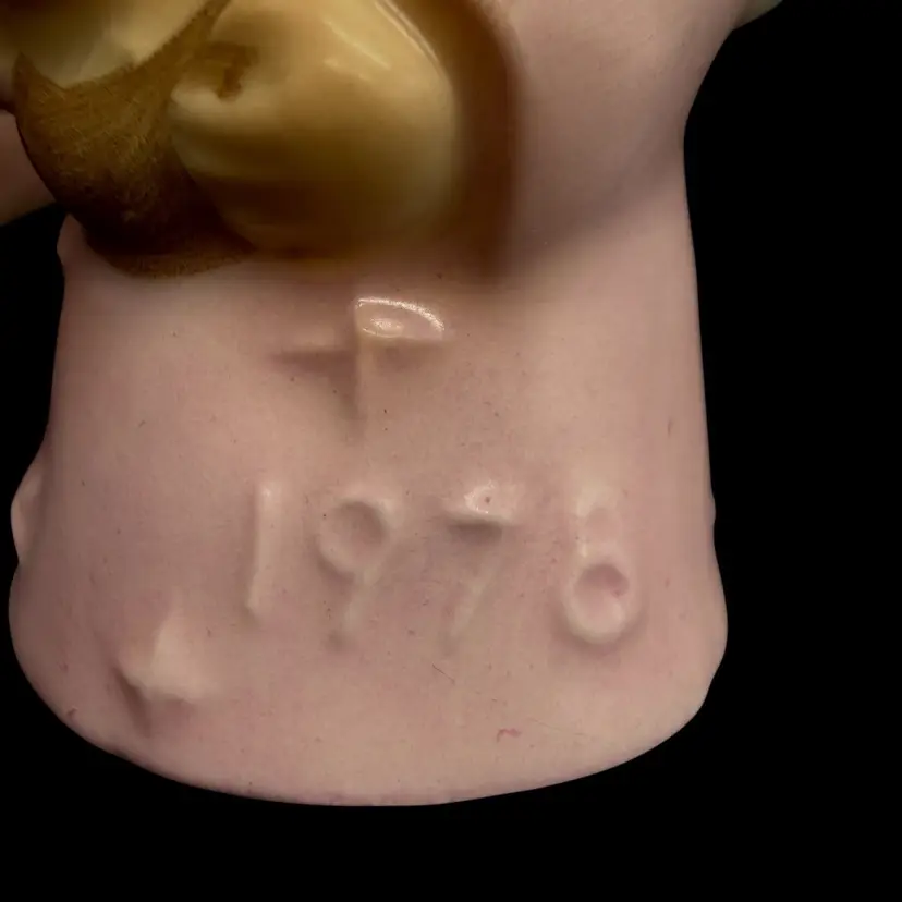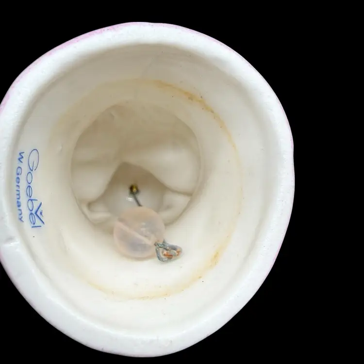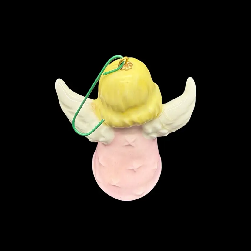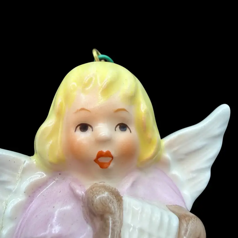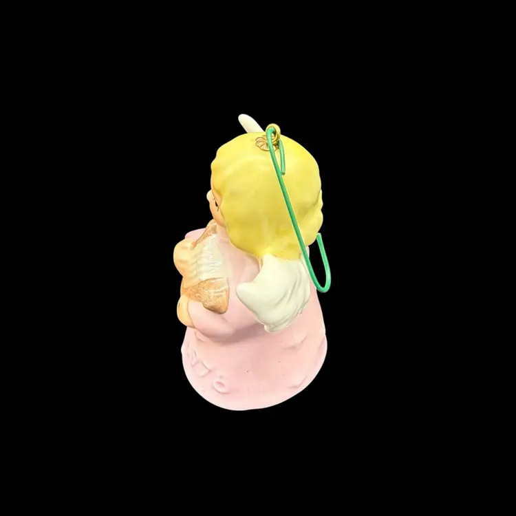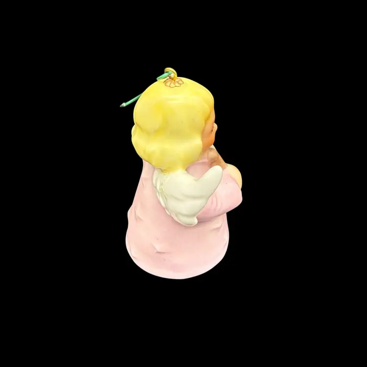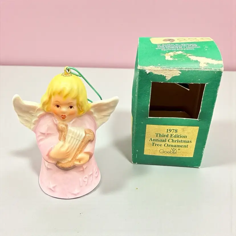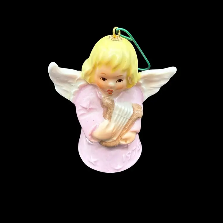 This 1978 Third Edition Goebel Annual Christmas Bell Ornament features a pink angel with a harp, made of porcelain in West Germany. This vintage ornament, part of a collection of ornaments, is a charming and nostalgic addition to any holiday decor. The angel design, along with its pink color and original production technique using pottery, makes it a unique and special piece for collectors or those looking to add a classic touch to their Christmas tree.