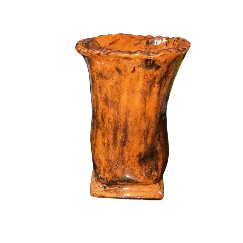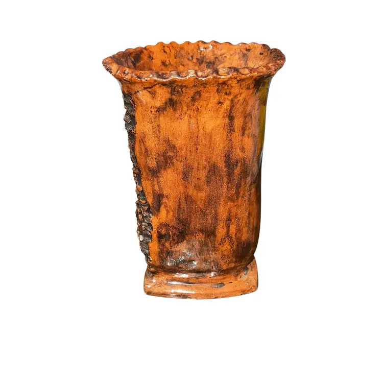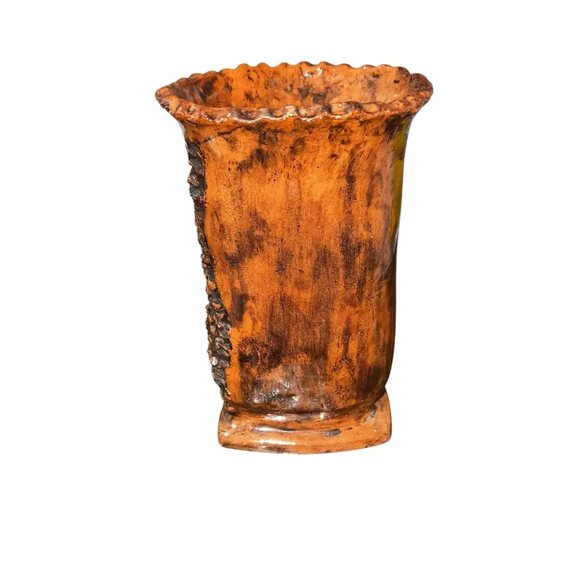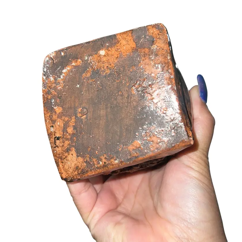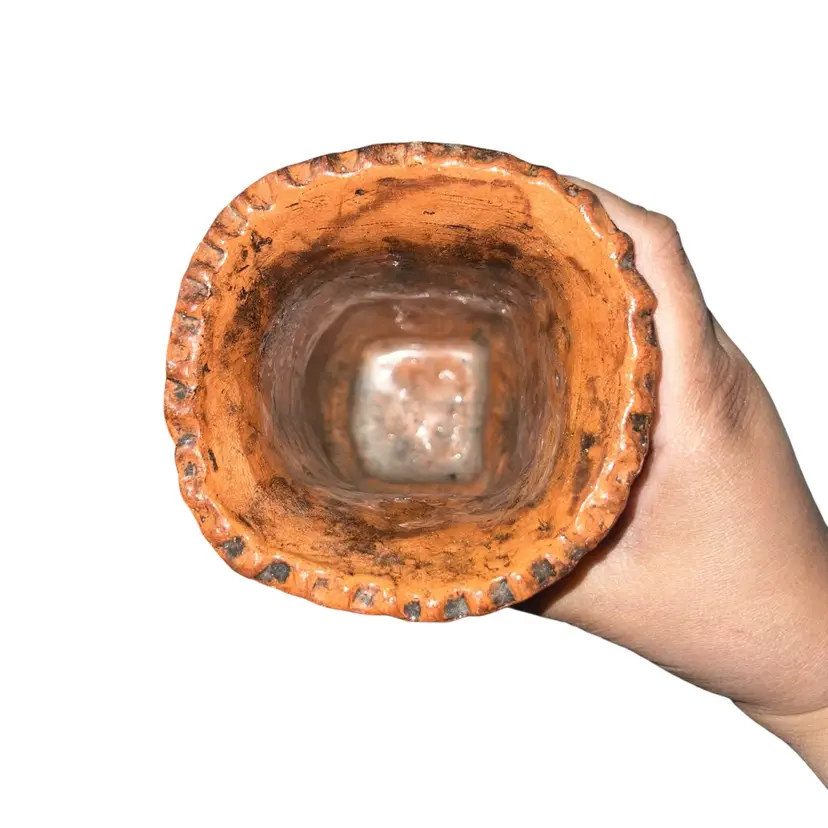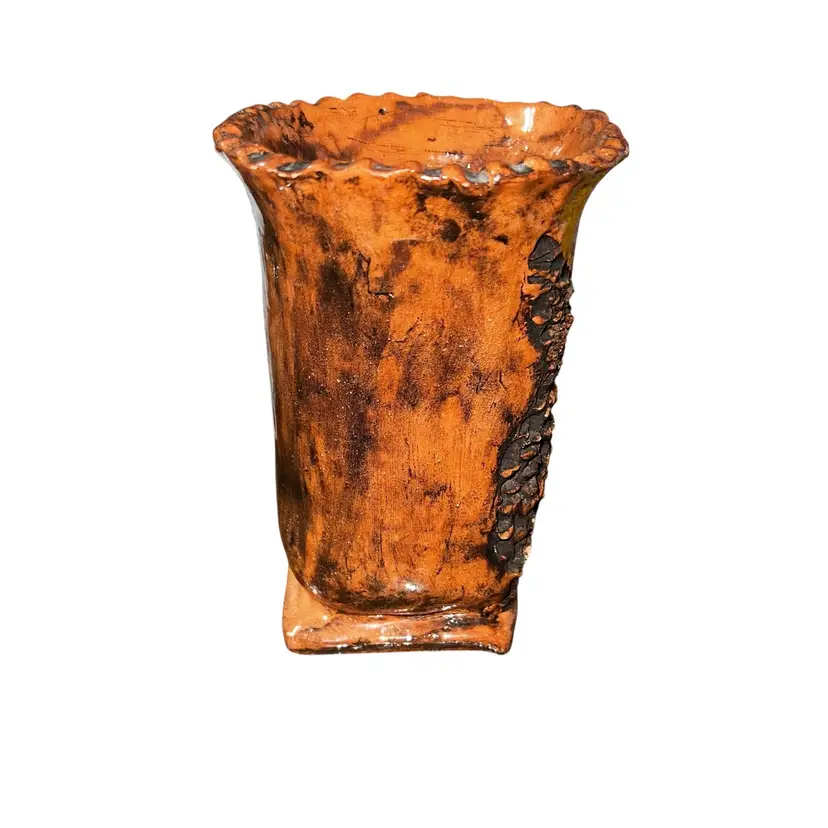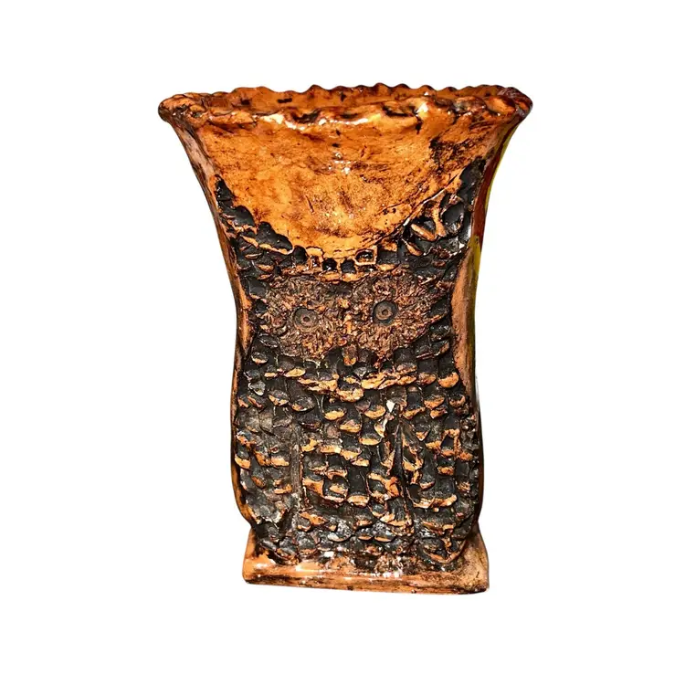 This bold sgraffito pottery vase showcases a striking brutalist owl design, carved into the surface with deep texture and rustic detail. The earthy glaze paired with the hand-incised lines gives the piece incredible depth and presence, making it a true statement of 1970s studio pottery. • Origin: Found in Boca Raton, Florida • Date: 1979 (signed and dated by the maker; signature is present but illegible) • Design: Sgraffito owl motif with brutalist surface texture and flared rim • Size: 6.25” tall × 4” diameter • Condition: Excellent vintage condition. No chips or cracks.