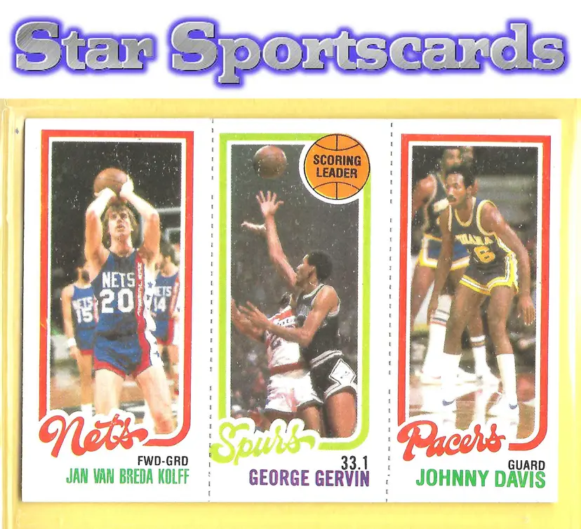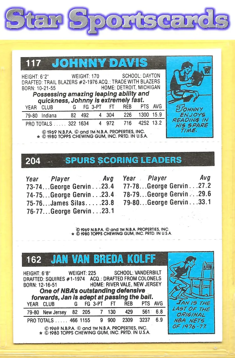 This is a nice example of a 1980-81 Topps #117 / 162 / 204 Jan van Breda Kolff / George Gervin / Johnny Davis TL .Other important information about this card: In Jan van Breda Kolff / George Gervin / Johnny Davis TL played for the Spurs.Please check out our other listings for more great cards.