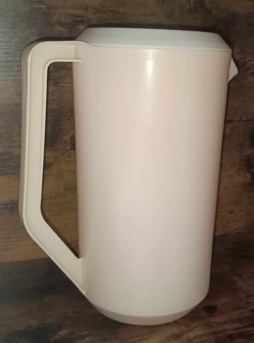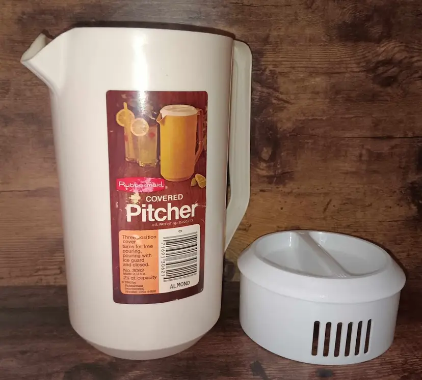 1980 Rubbermaid covered pitcher in almond color. In good condition with no damages or smells. It measures 9.5 inches tall and 5.25 inches across.