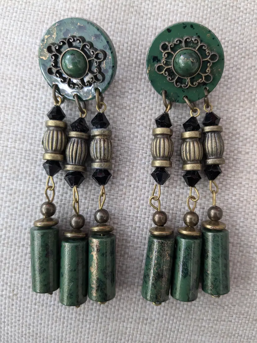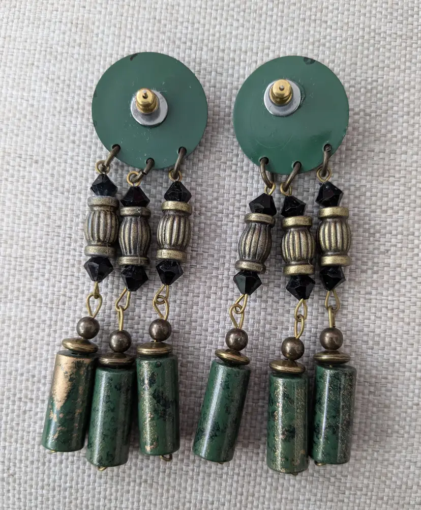 3-1/2" long with mottled green, black and bronze tone beads. Pierced, unmarked, excellent condition.