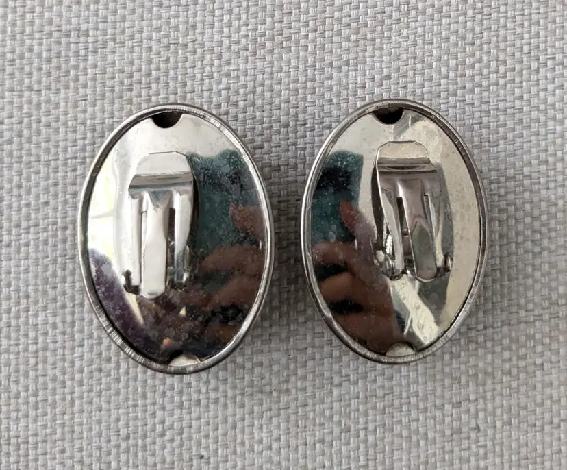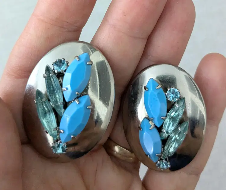 Very striking, 1-1/2" long, silver oval discs with sky blue and aqua stones, clip-on, unmarked
