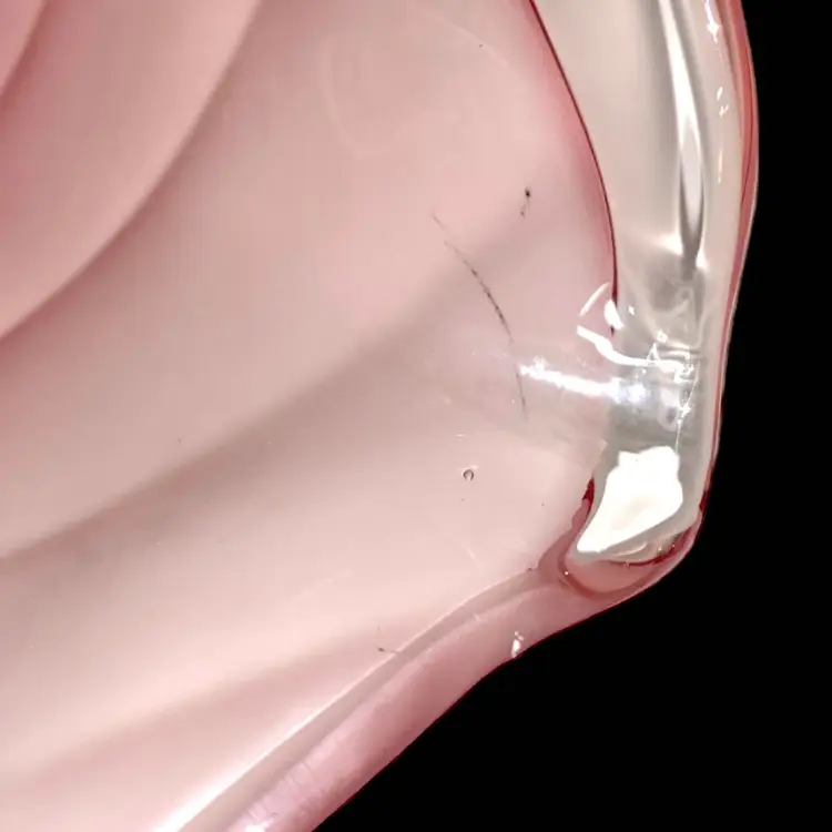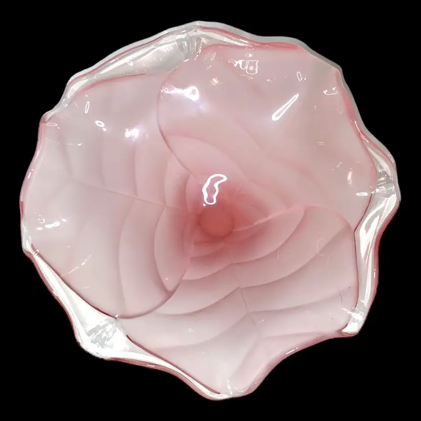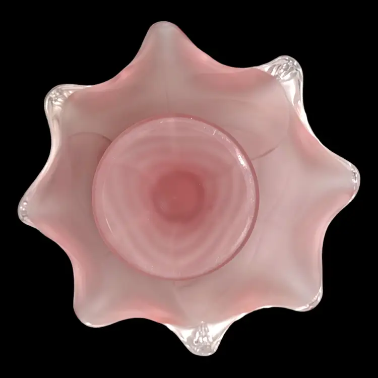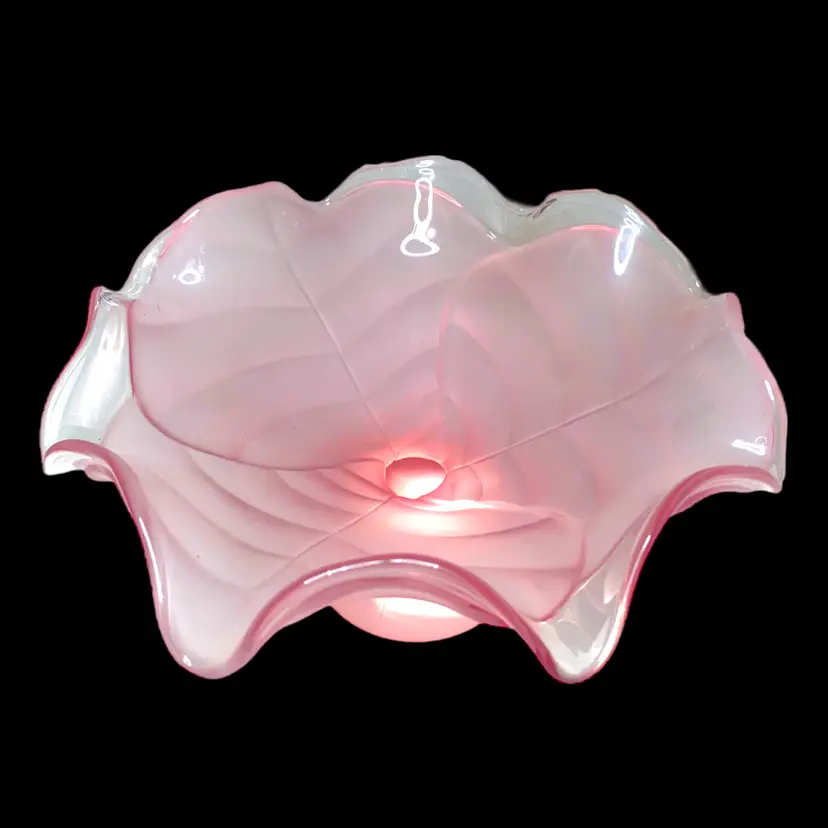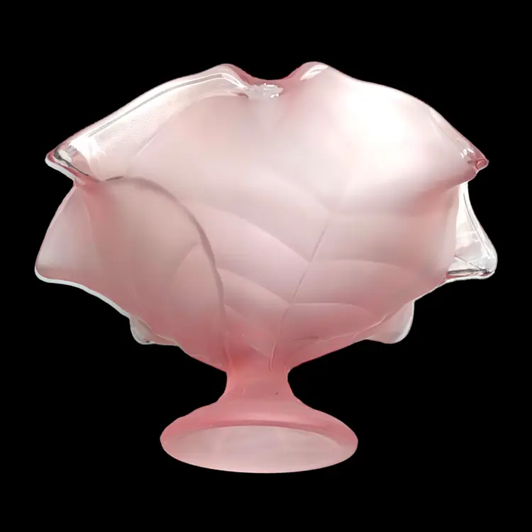 •Largest size of Viking epic leaf compote, catalog # 7622, frost pink; harder to find size in this color way; released in 1980 •11” wide, 5.75” tall •Condition is good but not excellent: has some scratches throughout from use, outside frosting has some smudges from oil-based products (may be removable/cleanable but don’t guarantee;) also has manufacturer flaw of ash inclusion on one petal (in glass,) Priced with these in consideration!