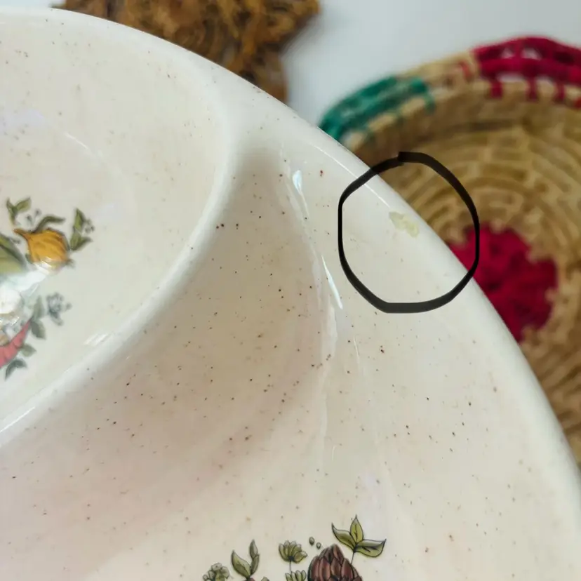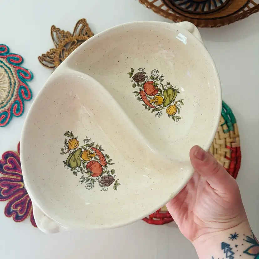 1980’s Divided Ceramic Serving Bowl with Mushroom & Vegetable Pattern - small chip shown