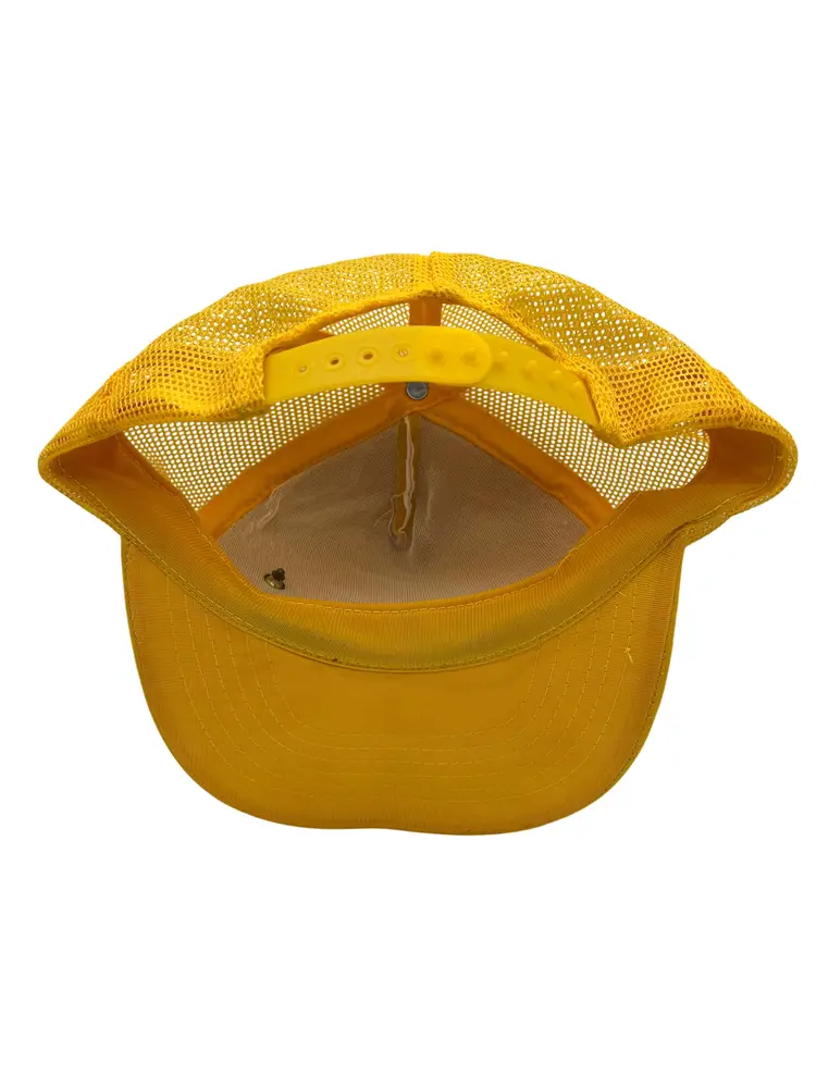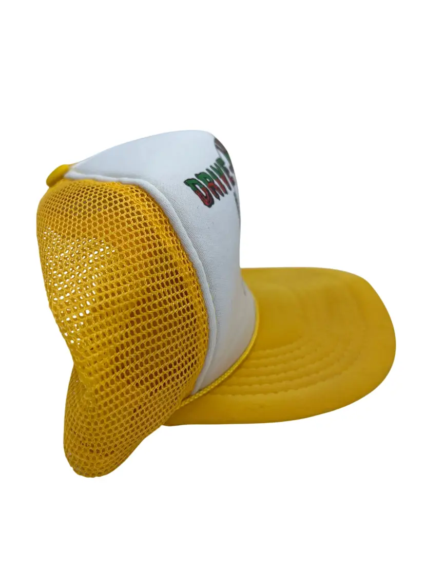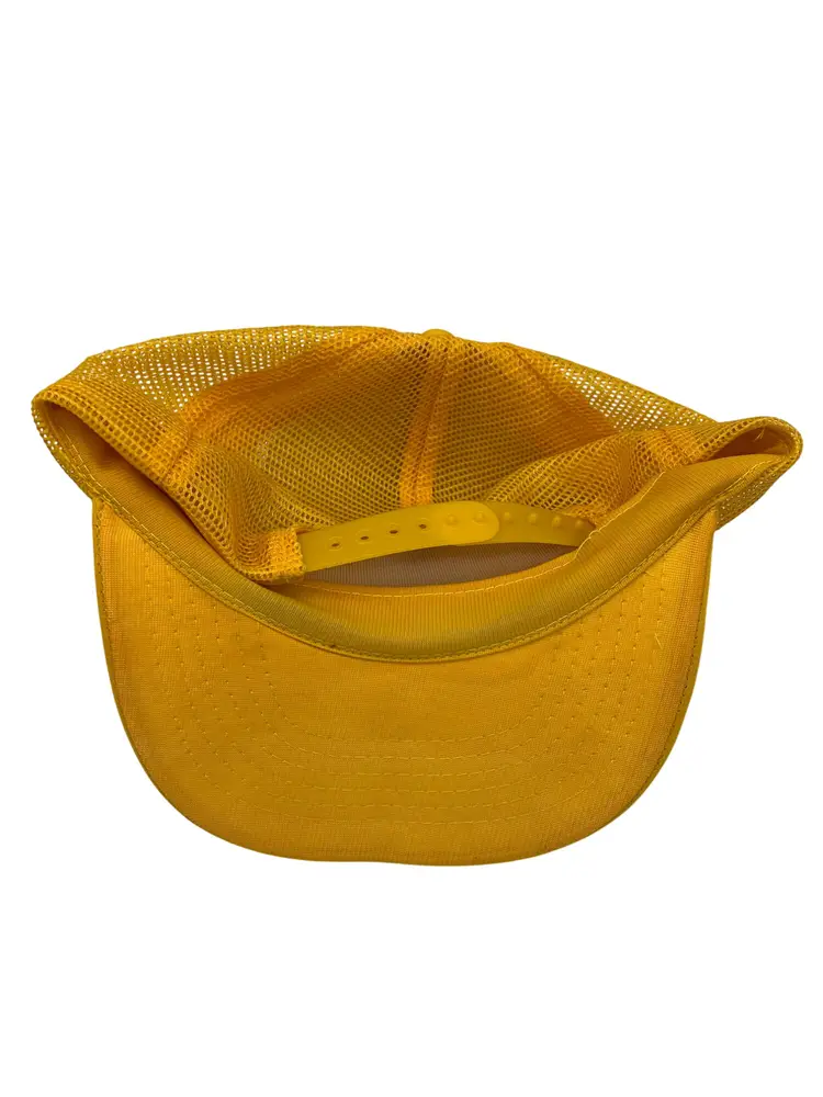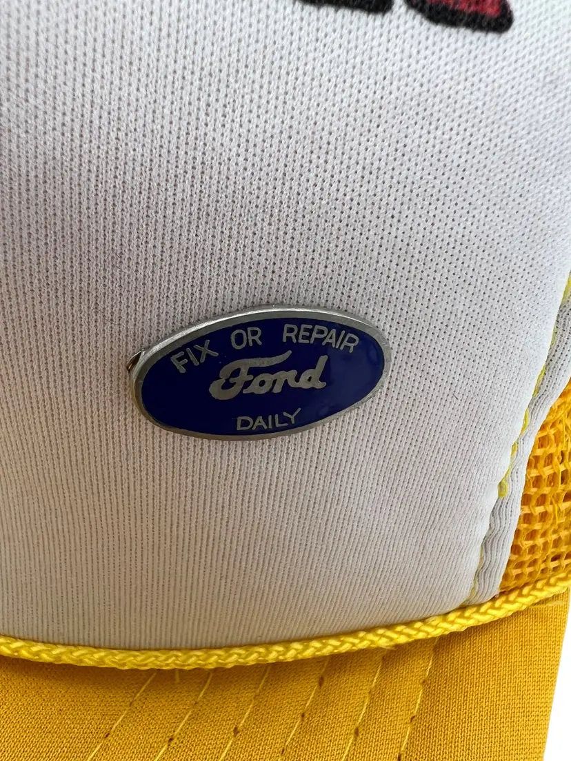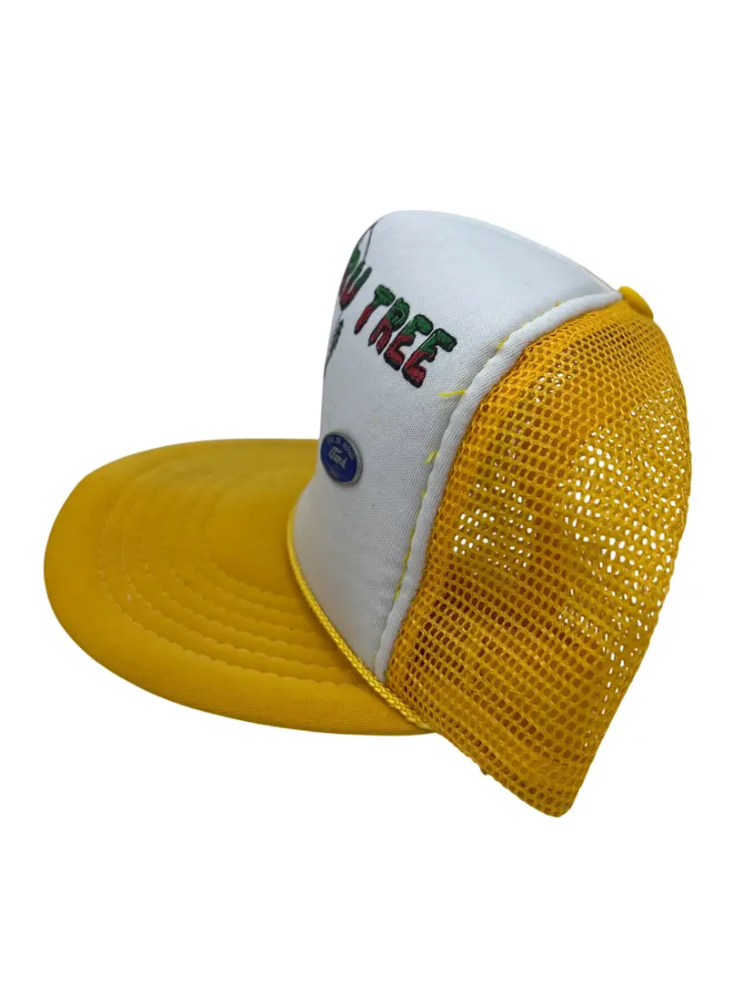 Vintage foam-front mesh trucker hat with rope across the brim from the Shrine Drive-Thru Tree (Avenue of the Giants, Myers Flat, California). Yellow mesh/snapback with white front panel and printed redwood graphic. Adjustable one-size fit. Found with a small enamel “Fix Or Repair Daily” Ford pin attached—pin is included. Approx. 8.25" x 5.75" x 3.5"H. A classic roadside-attraction souvenir with that true 80s trucker look.