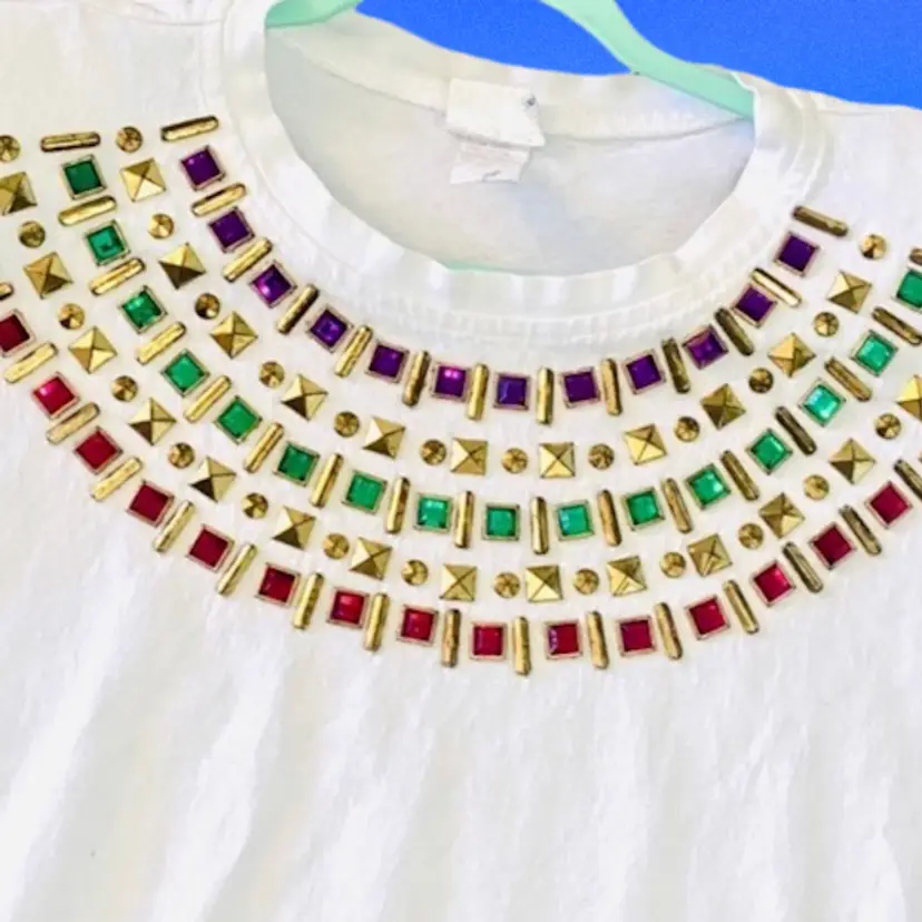100% cotton Plain on the back Just a white Tshirt with gemstone details at chest. Short sleeve Comfortable Wash gently inside out / hang to dry