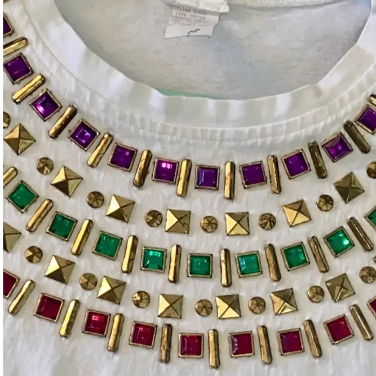 Good Condition- This adorable top is in great condition for its age. Still white and no stones missing. A perfect statement piece to a casual outfit or you could dress it up!