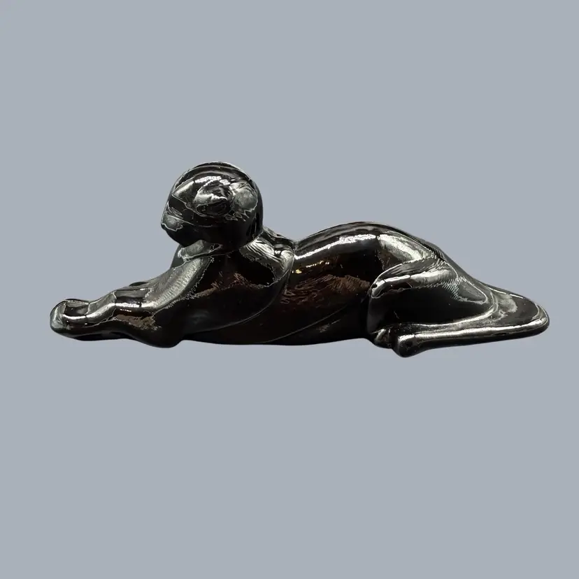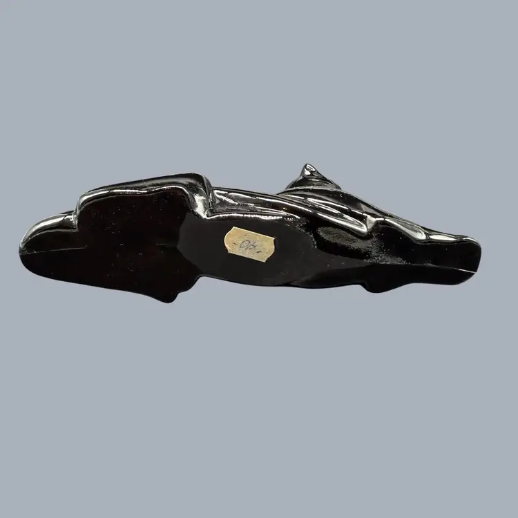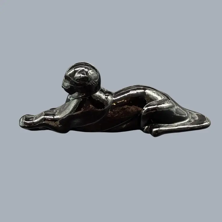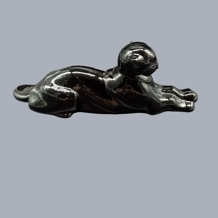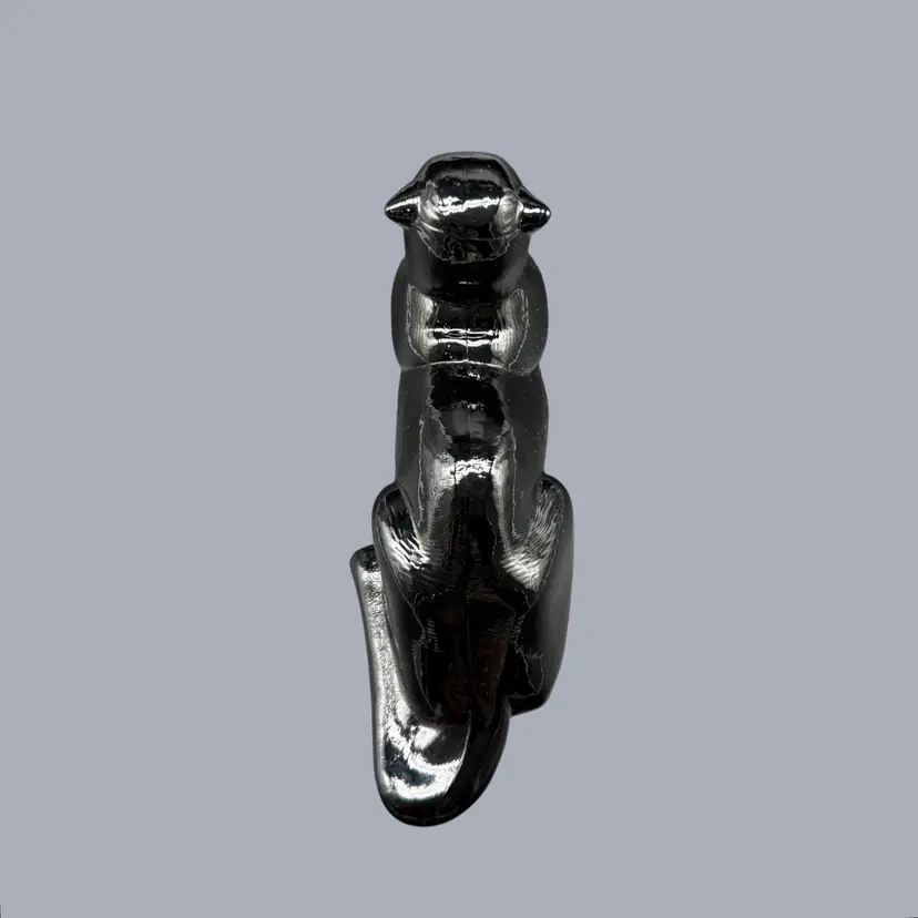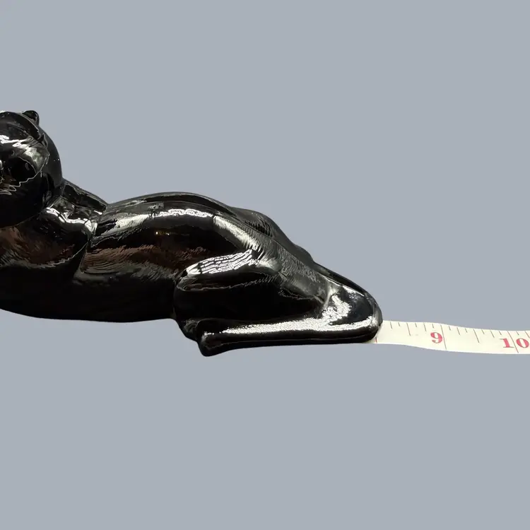 The 1980s Imperial Glass Black Ebony Panther Tiger Cat Paperweight Figurine is a vintage collectible made in North America. This pressed glass figurine features a solid black color with a glossy finish, depicting a majestic panther or tiger cat. Signed ALIG, representing the Arthur Lorch Imperial Glass mark, used in 1981-1982, prior to the glass brand’s bankruptcy, this art glass piece embodies the Art Deco style of the era. A unique addition to any decor, this original figurine reflects the period's themes of animals and periods & styles, making it a valuable piece for collectors of vintage American glass.